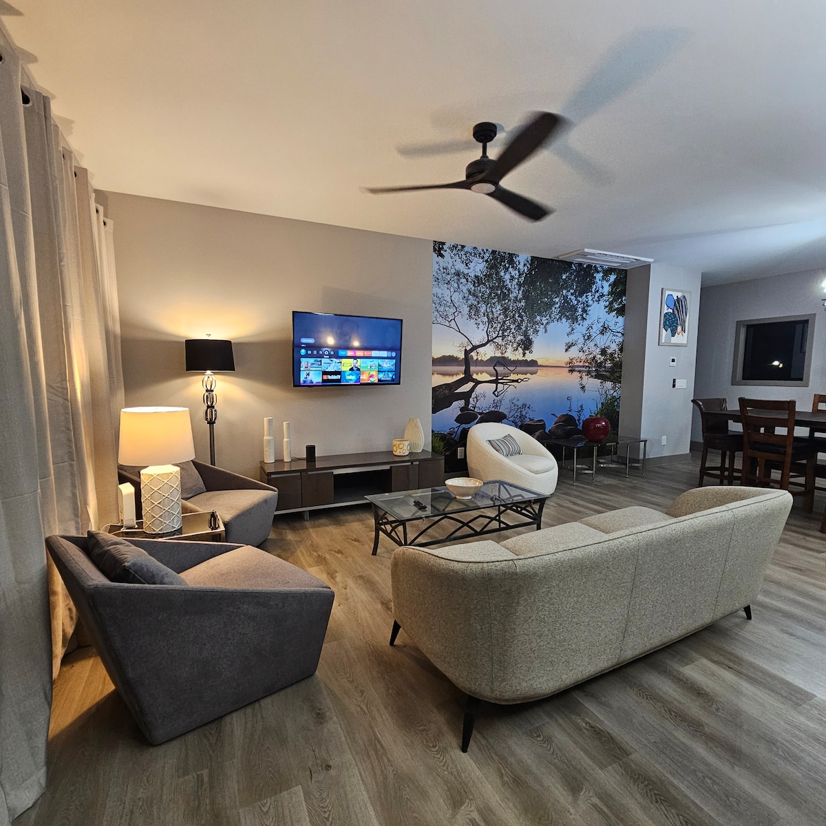 Welcome to Raventree Retreat, a luxurious 4BR, 3BA getaway in the picturesque and tranquil suburb. Soak up the sun while sipping refreshing cocktails and sizzling tasty BBQs, shoot some hoops on the private court, relax in the high-end interior, and explore stunning attractions and natural landmarks. ✔ 4 Comfortable Bedrooms + Sofa Bed ✔ Relaxing Living Room ✔ Fully Equipped Kitchen ✔ Backyard (Basketball Court, Deck, BBQ) ✔ Smart TVs ✔ High-Speed Wi-Fi ✔ Office ✔ Laundry ✔ Free Parking