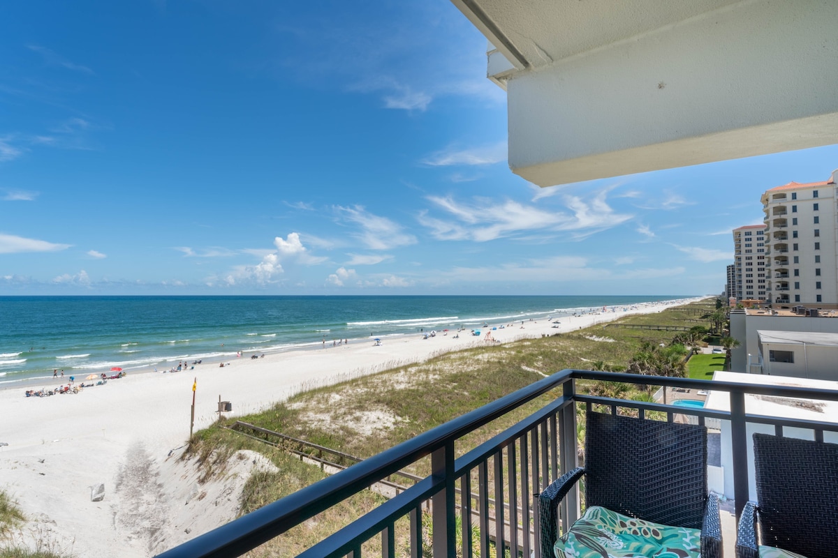 Beachfront 2 bedroom, 2 bathroom condo in North Jacksonville Beach w/ pool & hot tub. Huge balcony overlooking the Atlantic Ocean. Security-gated condo...Great location to nearby Mayo Clinic, TIAA Bank Field (NFL Jacksonville Jaguars & College Football Games), Sawgrass Country Club (TPC), Daily’s Place (concert venue)..Close to restaurants & shops...Gym (same floor as condo)...Great fun, private escape for vacationers...Quality, clean oceanfront condo for professionals in Jax on business