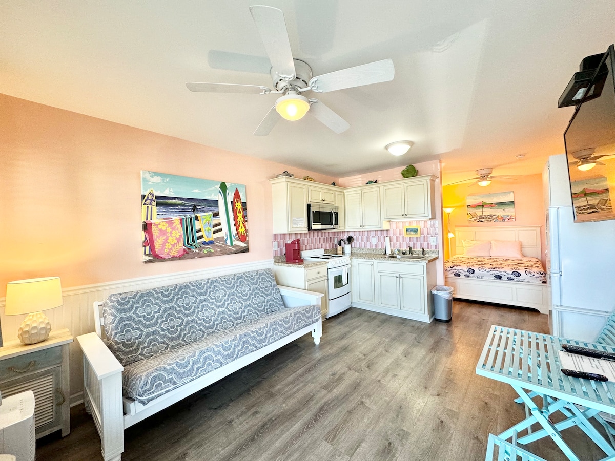 Small, Cozy Space-Big Value! Newly Remodeled End Unit Studio Steps From Sugar Sand Atlantic Beach One Queen Bed Fully Equipped Kitchen w/ Fridge, Stove, Microwave, Keurig & Drip Coffee Makers, Toaster, Blender, Pots, Pans, Utensils, Plates, Cups Modern Bath Free Wi-Fi Free Cable-TV Linens Included (Towels & Sheets) Free Parking Private Pool Access Charcoal Grill at Poolside (Bring Your Own Briquettes) Credit Card Laundry Facility next to Game Room. PLEASE NOTE: Beach Towels NOT PROVIDED