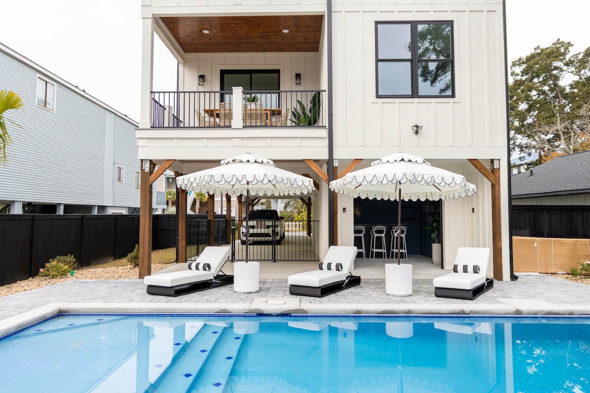 Enjoy our 2nd Row, Newly Constructed Dream get-a-way Paradise with Family and Friends! This 2 story home has 5 Bedrooms, 4 Full Baths, 2 Social Gathering Rooms, and Kitchens Up & Downstairs. From the bottom balcony, enjoy a 60 second walk to the Beautiful Sands of N. Myrtle Beach. You will also enjoy a Private Pool with Night Lights for evening swims! And don't forget the adjustable hoops bball goal, 2 Beach Bikes and a 5 minute walk to local gift shops, restaurants & incredible Parasailing!
