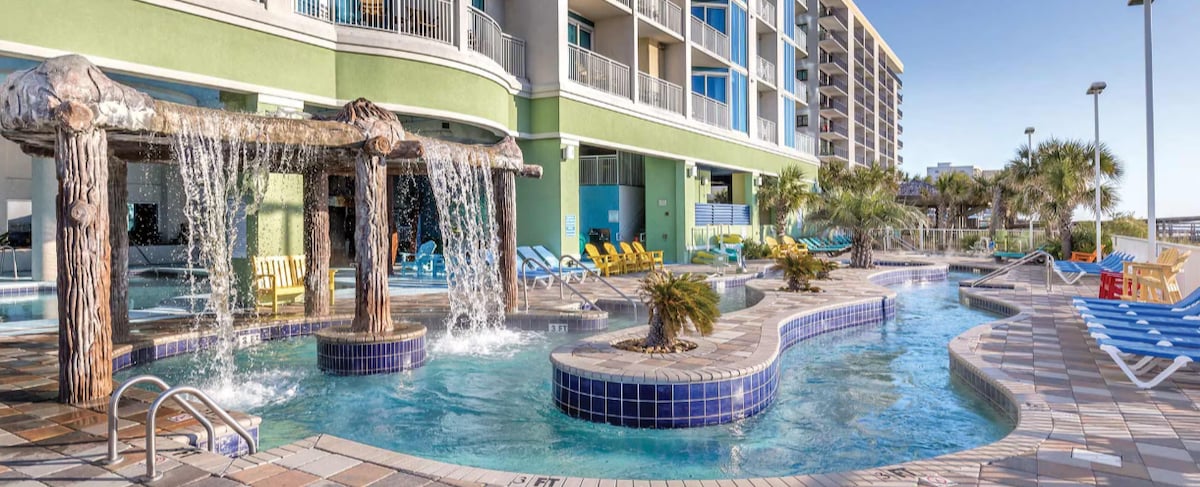 Dear guest, you must be 21 years or older to check in. Located just outside the buzz of Myrtle Beach, this peaceful oceanfront resort offers the best of both worlds — close to top attractions, yet perfectly tucked away. Dive into fun with a full schedule of on-site activities, or simply relax by the indoor/outdoor pool with sweeping ocean views. Explore 60 miles of beautiful coastline, hit nearby golf courses, or shop and dine at Barefoot Landing and Broadway at the Beach.