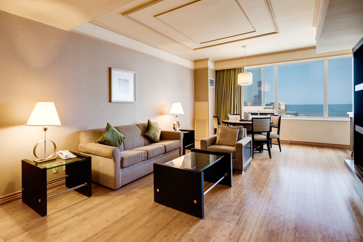 Indulge in elevated coastal luxury in this oceanfront balcony suite overlooking the Atlantic City Boardwalk. Enjoy a spacious living area with a sofa. The private bedroom includes its own TV and cozy settee, leading to a spa-inspired master bathroom with a Jacuzzi tub and separate stall shower. **No Cleaning Fees, No Hidden Fees!!** ✔ Ocean Resort Casino - 7 min walk ✔ Hard Rock Casino Atlantic City - 8 min walk ✔ Atlantic City Convention Center - 3 min drive