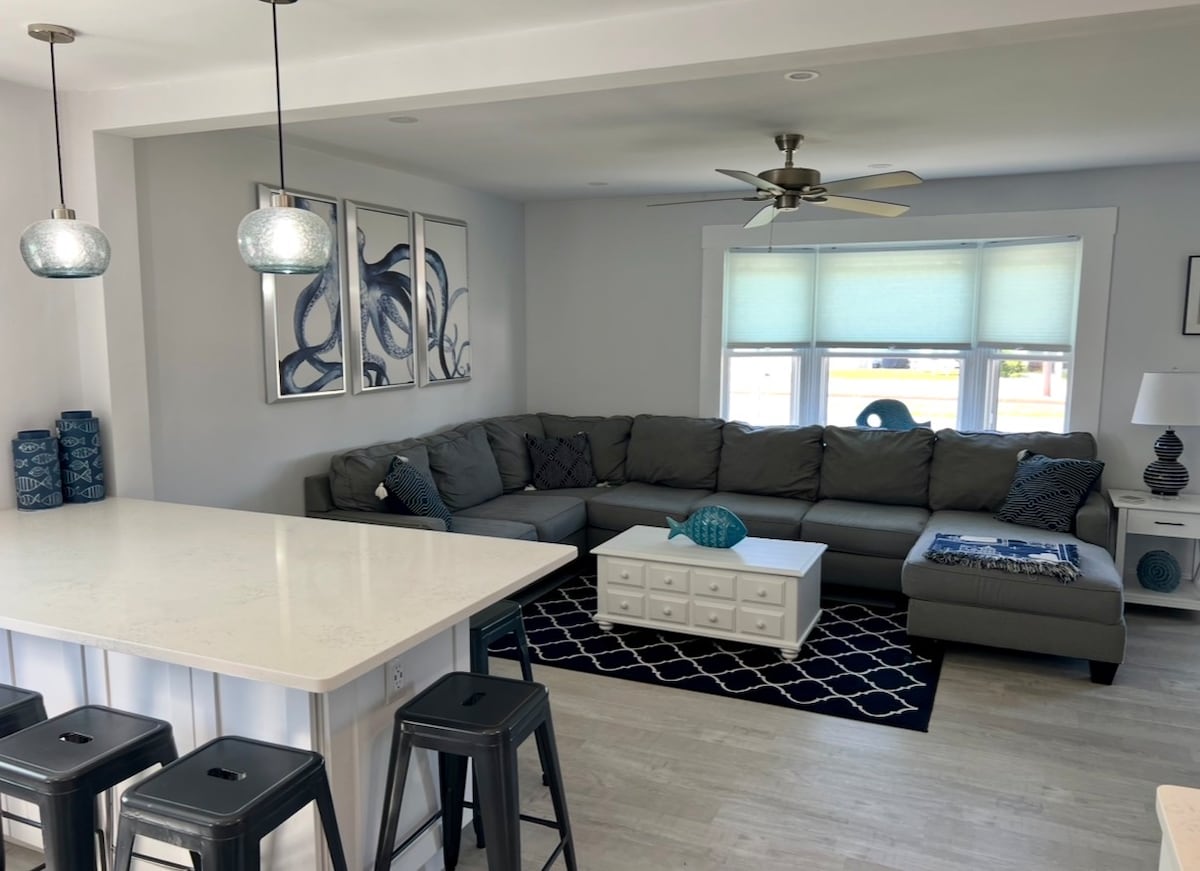 All the comforts of home and walking distance to the boardwalk and beach! Kitchen with everything you need for cooking. Smart TVs in the living room and bedrooms. Games, puzzles, and kids books for entertainment. Washer and dryer free in unit. Open concept living, very clean and comfortable. Sit on the front porch to enjoy the bay view and salt air. Beach tags, chairs, sand toys, and towels provided for summer. Housebroken dogs are welcome to come with you. We have a fully fenced backyard.