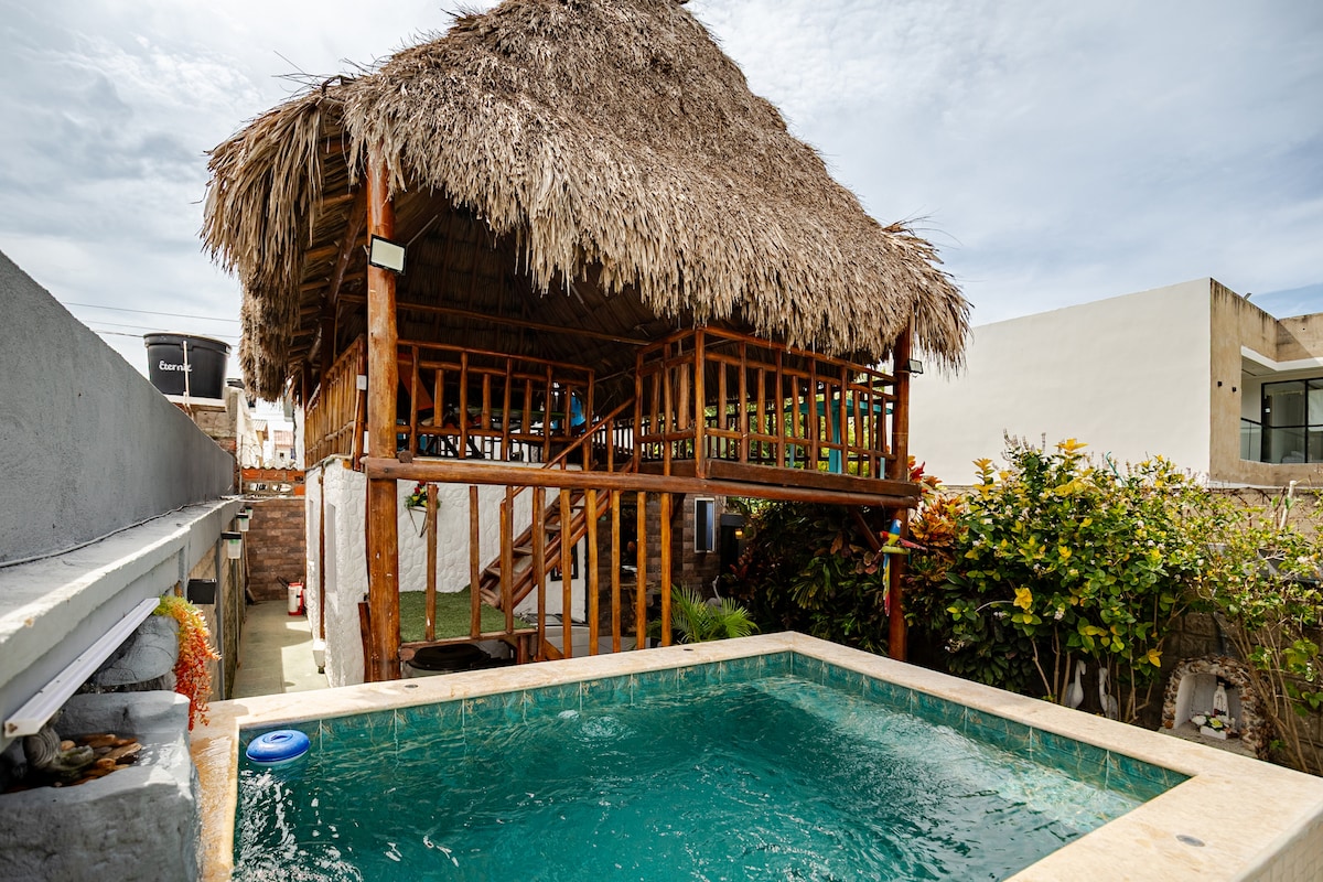Cabaña Mandalay : Hemos diseñado esta casa pensando en la paz y comodidad. con su acogedora sala de estar hasta la terraza con vistas panorámicas, perfecta para tomar un cafe por la mañana o un coctel al atardecer. Aquí, cada día es una oportunidad para crear recuerdos inolvidables, ya sea con Una caminata hasta la playa , una cena bajo las estrellas o simplemente leyendo un buen libro en su jardín interior,a su llegada te invita relajarte en su piscina, y disfrutar de sus espacios verdes..