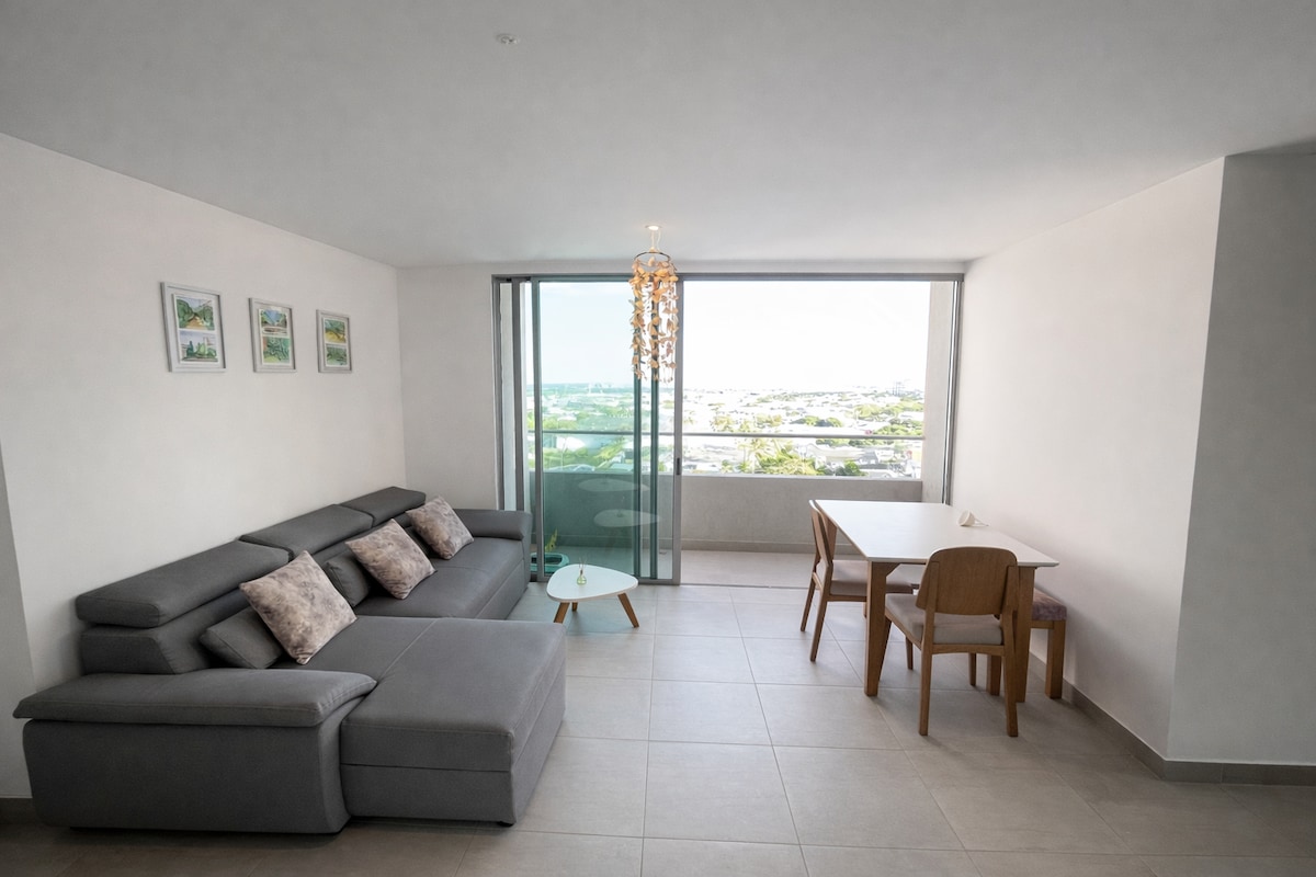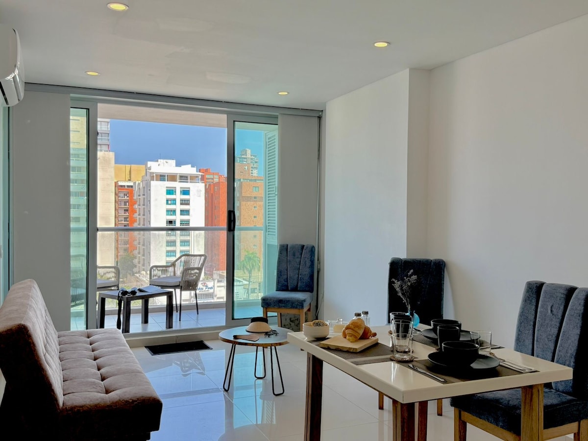 Modern apartment located in one of the most exclusive neighborhoods in Barranquilla. *Flexible check-in and check-out *1 bedroom with queen size bed and air conditioning. *Living room with sofa bed and air conditioning. *Fully equipped kitchen with utensils, basic appliances and washing machine. *Swimming pool, sauna, Turkish bath and rooftop terrace. *Smartfit gym nearby. *Free private parking. *Close to VIVA and Buenavista shopping centers, and to the main clinics and tourist areas.