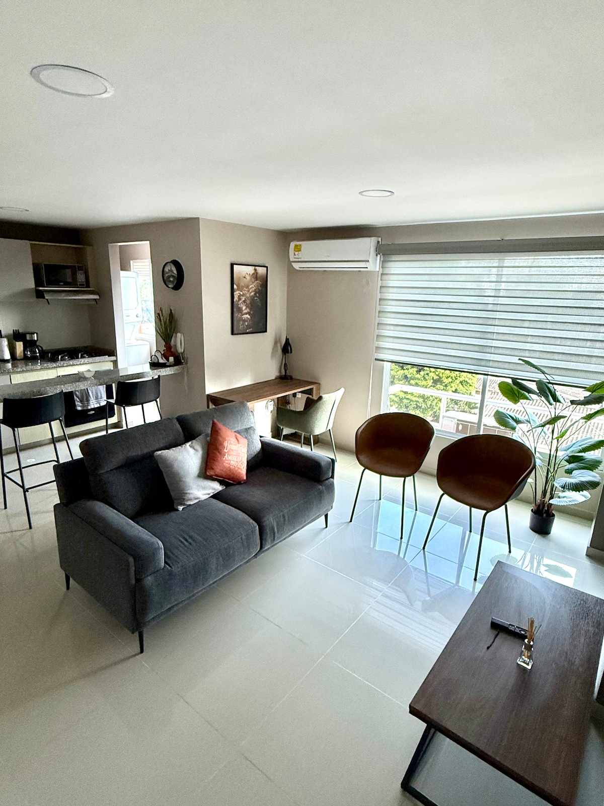 Es un apartamento, completamente independiente y exclusivo para el huésped, con 2 habitaciones, dos camas dobles, un sofacama, 2 baños, aire acondicionado, cocina completa y equipada, barra desayunadora, área de labores con lavadero manual y lavadora automática, nevera, Internet, Televisor smart, Tv cable, Netflix, Disney+, limpieza semanal gratuita para estancias largas si lo solicita.