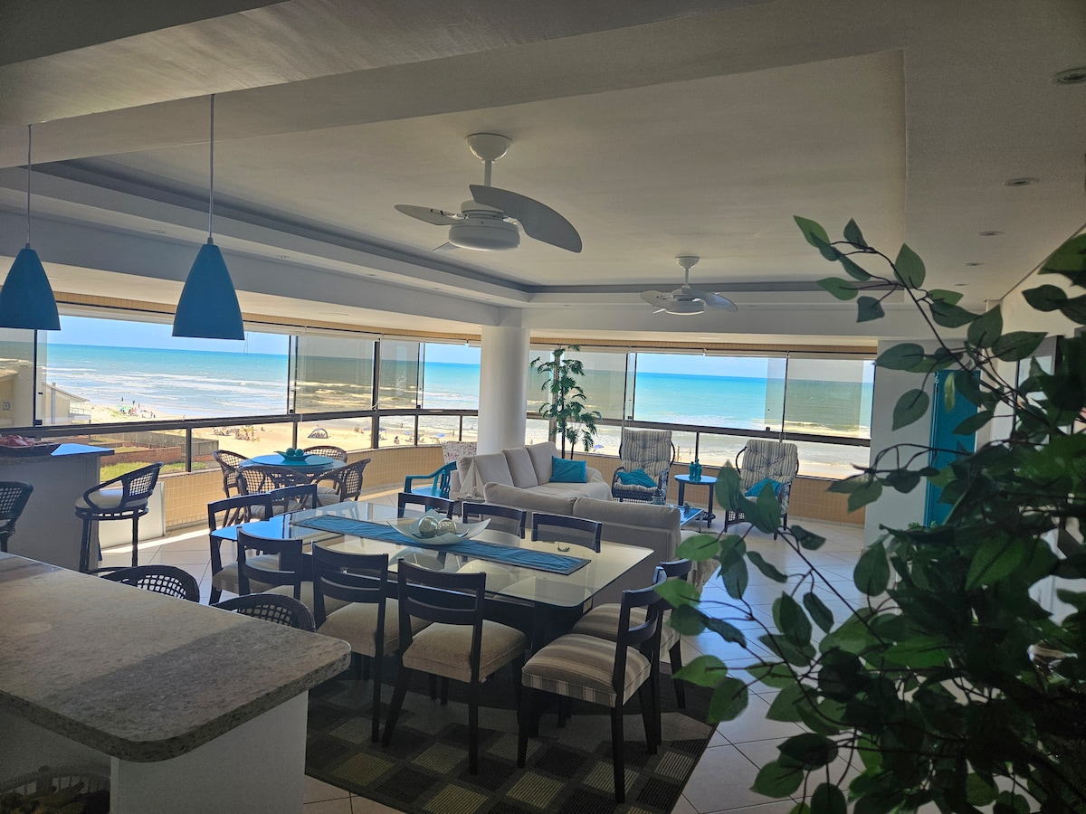 IMENSA VISTA PARA O MAR! Apto com 5 dormitórios(1 suite e 4 demi suites), lavabo, lavanderia, cozinha completa e ampla área social com churrasqueira. 3 vagas de garagem coberta. Condomínio com piscina térmica, academia e segurança 24 horas. A reserva inclui lençóis 300 fios, edredons, travesseiros.