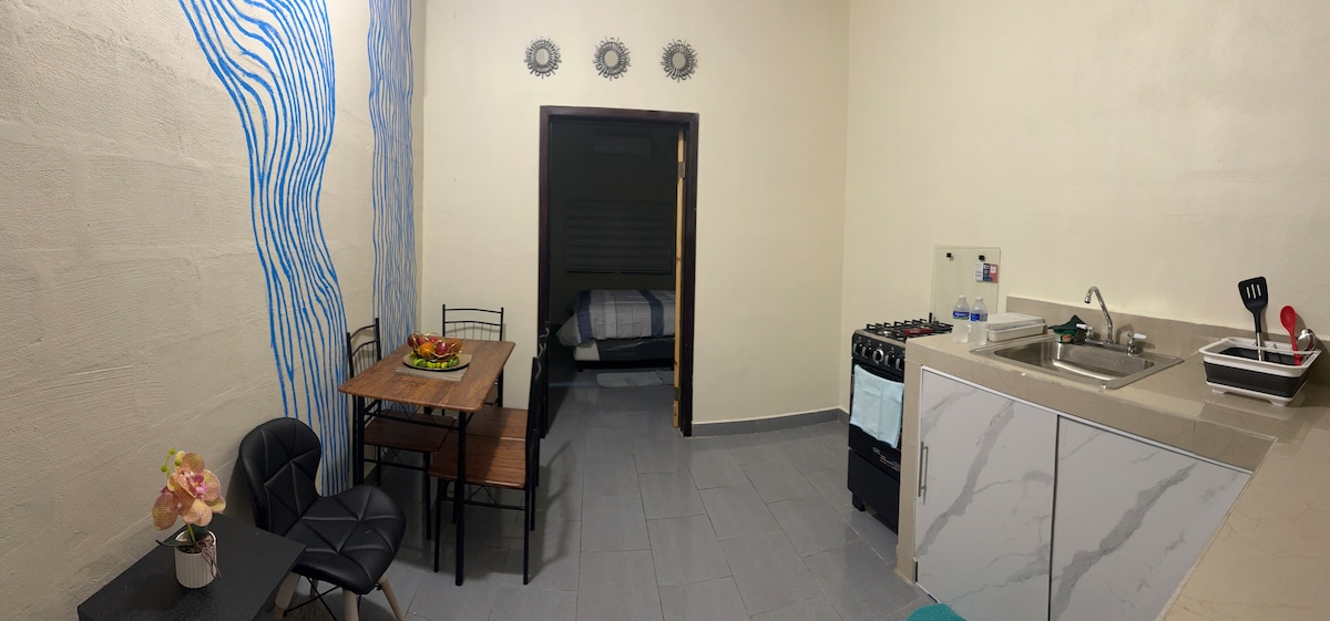 Encantador apartamento nuevo con una estancia acogedor de una pieza amueblado perfecto para disfrutar con tu acompañante, con cocina equipada (refrigerador, microondas, estufa eléctrica, tostadora, hervidor eléctrico), baño, aire acondicionado, y un lugar de trabajo, además con un patio con hermosa vistada de un árbol de ceiba. Excelente ubicación, con acceso pavimentado: Centro - 8 min Muelle de Cabotaje - 10 min Aeropuerto Internacional Golosón - 20 a 25 min Farmacia más cercana - 3 min