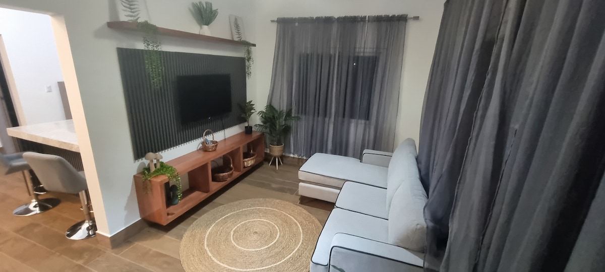 Disfruta de una estancia única en este moderno apartamento con acabados de lujo, diseñado para brindar comodidad, elegancia y una experiencia inolvidable. Perfecto para familias, parejas o viajes de negocios. Excelente Ubicacion a solo 3 minutos de la playa de TelaMar, cuenta con piscina compartida para todo el complejo, ubicado en la avenida principal donde esta el aeropuerto cerca de restaurantes, minisuper y tiendas de conveniencia.