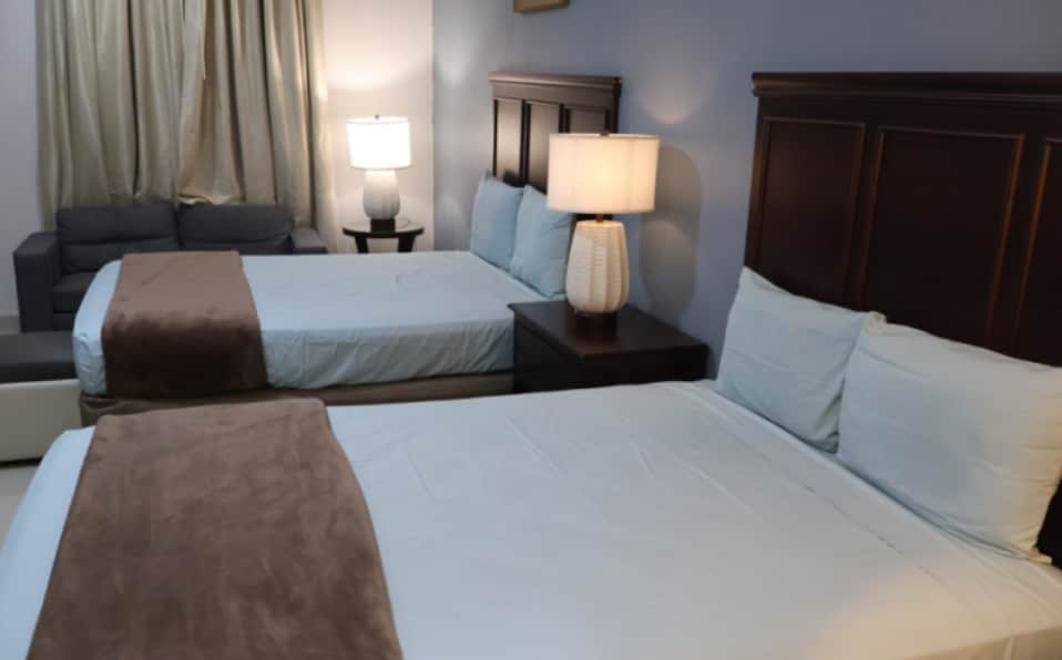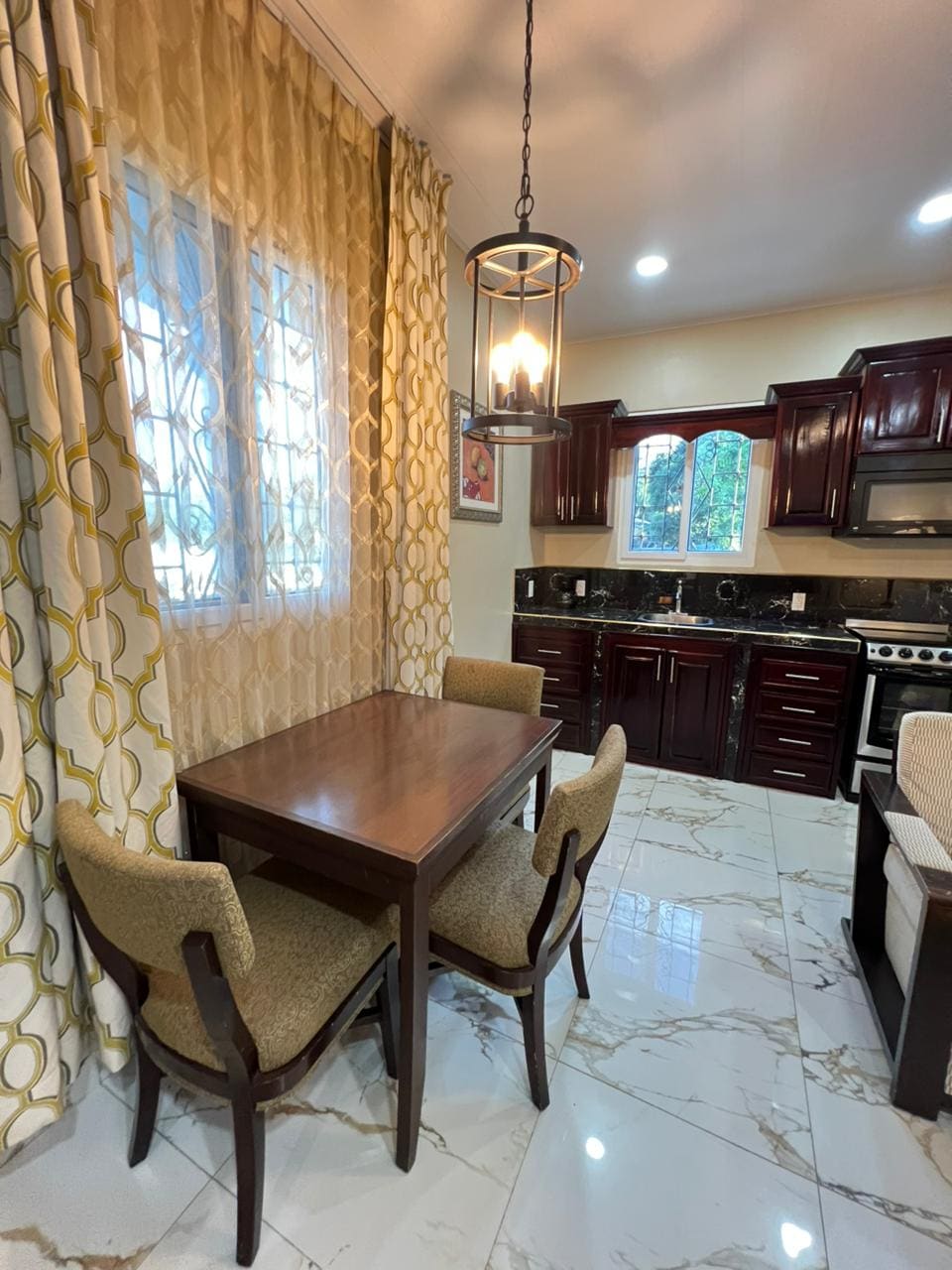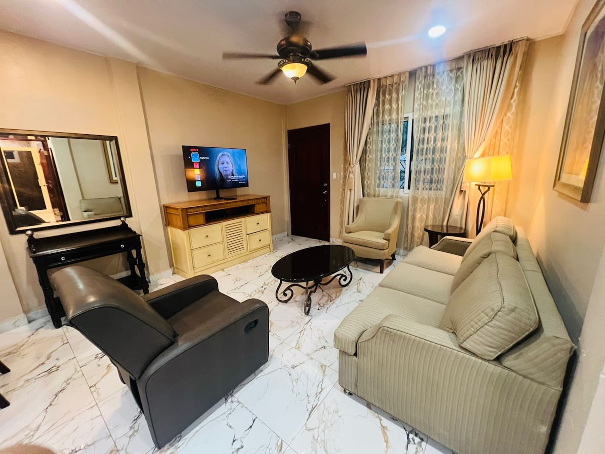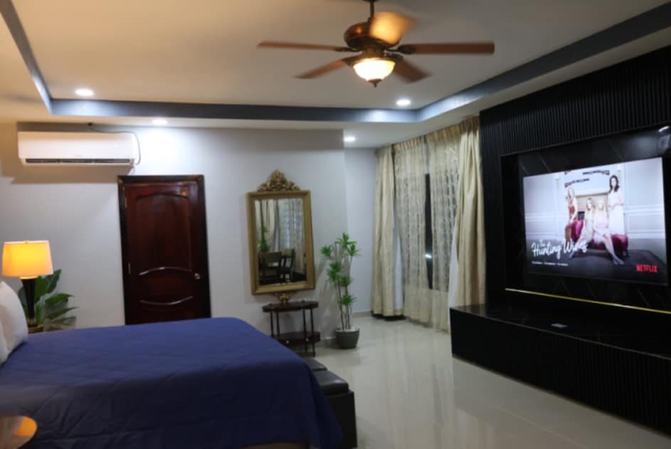 El espacio integra un comedor funcional, mobiliario de madera y una decoración cálida que combina detalles clásicos con un ambiente acogedor. Dispone de buena iluminación natural, cortinas completas para mayor privacidad, ventilador de techo y aire acondicionado para garantizar confort en todo momento. Son apartamentos totalmente amueblados pensados para quienes buscan amplitud, orden y una estancia tranquila, ya sea por trabajo o descanso.