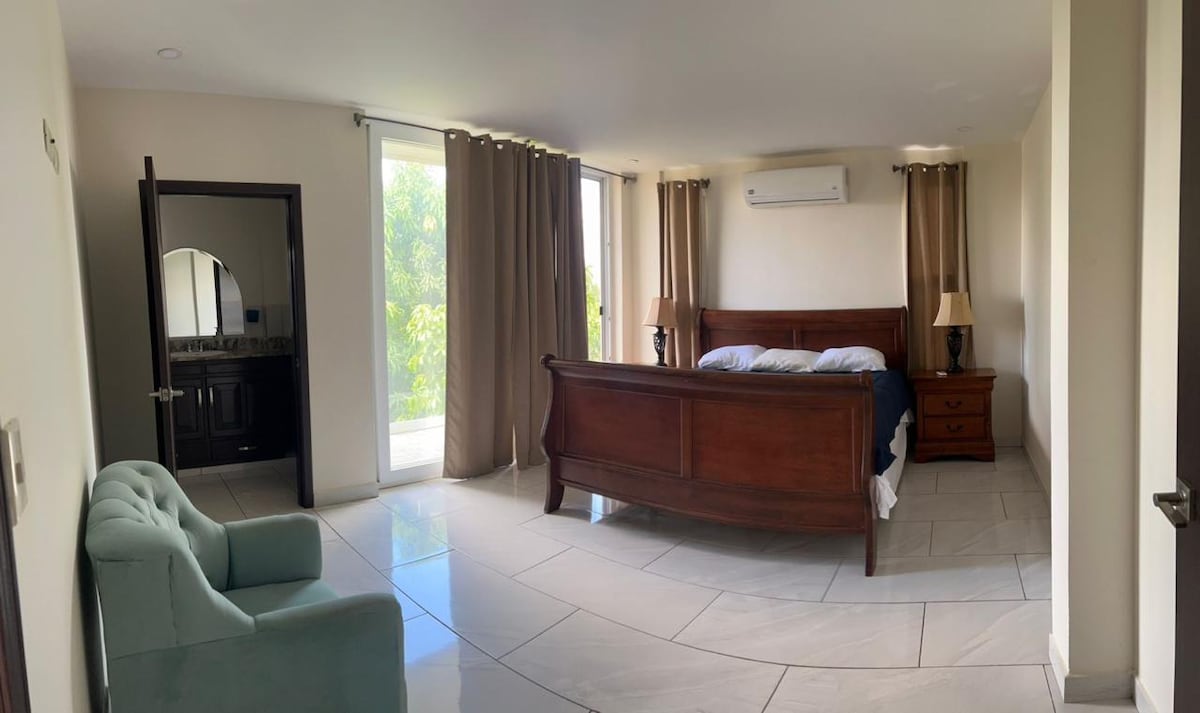 La propiedad cuenta con: 2 habitaciones con aire acondicionado (una cama matrimonial en cada una) 1 baño con agua fría y caliente WiFi de alta velocidad y área de trabajo con impresora Sala, comedor y cocina totalmente equipada Jardines y áreas al aire libre ideales para compartir Estacionamiento techado privado para 3 vehículos Además, ofrecemos servicio de transporte y alimentación con costo adicional.