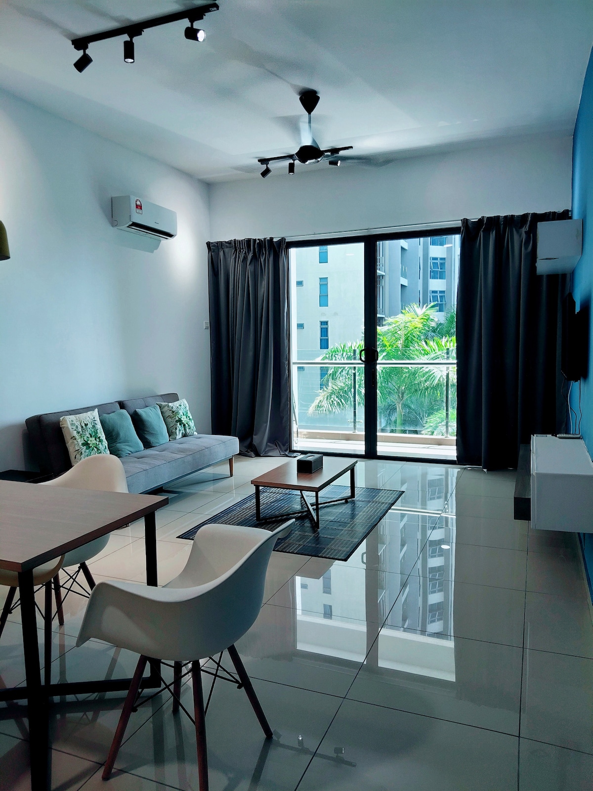 Forget your worries in this spacious and serene space. I got it cover for you and your big family staycation This is one bedroom unit, comfortably for 8-10 people.. In a bedroom 2 Queen bed 1 wardrobe 3 floor mattress Aircond Fan Living room 1 sofa bed 2-3 person 1 fluffy sofa Smart TV Aircond Fan Kitchen Big fridge Water Coway Cooking utensil 6 Seater dining table Workstation in the unit Can cook in the unit Washing machine provided