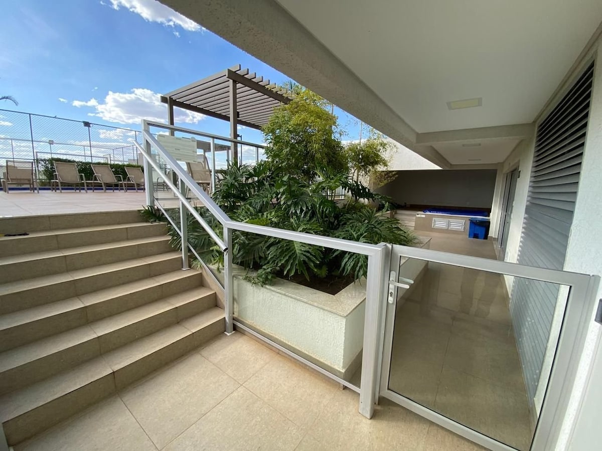 Este lugar único tem um estilo próprio. Fica a 100 metros do melhor Shopping da cidade, o Flamboyant, possui bons restaurantes, supermercados, padarias, tudo isso bem próximo. A localização é a melhor possível, a vista da sacada é simplesmente incrível. A decoração é moderna. Possui Piscina na cobertura, academia, sauna e lavanderia no térreo, compre a ficha da lavanderia na recepção.