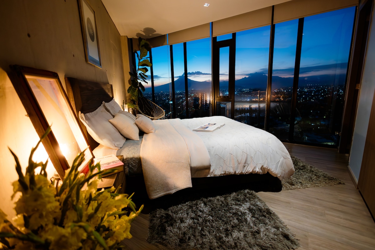 Wake up to a unique volcano landscape from the 18th floor. A spacious loft that blends style and comfort—ideal for families or longer stays. Features comfortable Queen beds and accommodates up to 6 guests (2 people each bed). Fully equipped kitchen, electric blinds, and high-speed Wi-Fi. 24/7 gym, 360° rooftop, covered parking, and a pet-friendly building with on-site guard and 24/7 security. Superhost with 4 years of outstanding reviews.