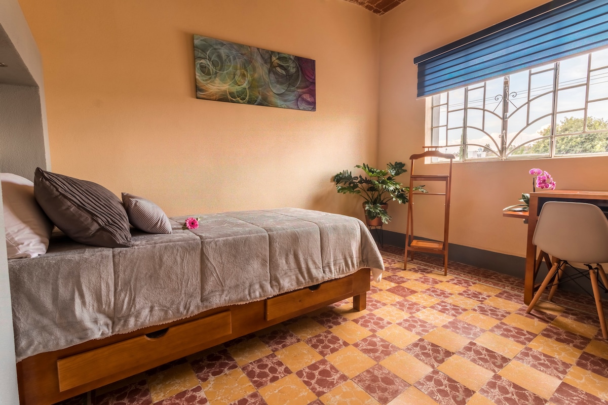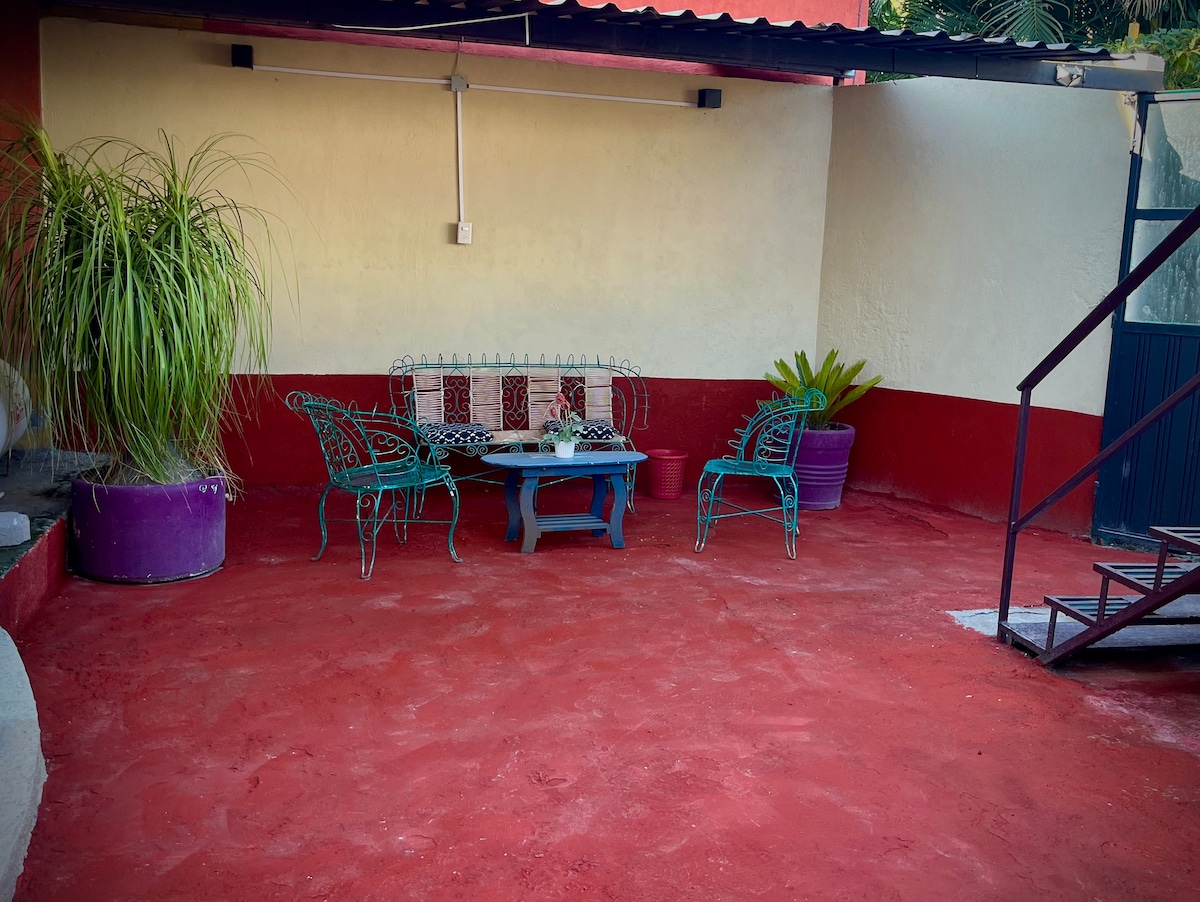 El alojamiento se ubica en zona sencilla y segura, en un tercer nivel. Una estancia abierta, completa, colorida y bien iluminada. Muebles con acabado rústico en madera natural. El baño ( con agua caliente) y la cocina son completos e independientes, con posibilidad de alojamiento para un tercer huésped en un sofá cama con costo adicional de $100.00. Estacionamiento opcional a una cuadra para autos compactos exclusivo del alojamiento con costo por noche. No apto para fumadores.