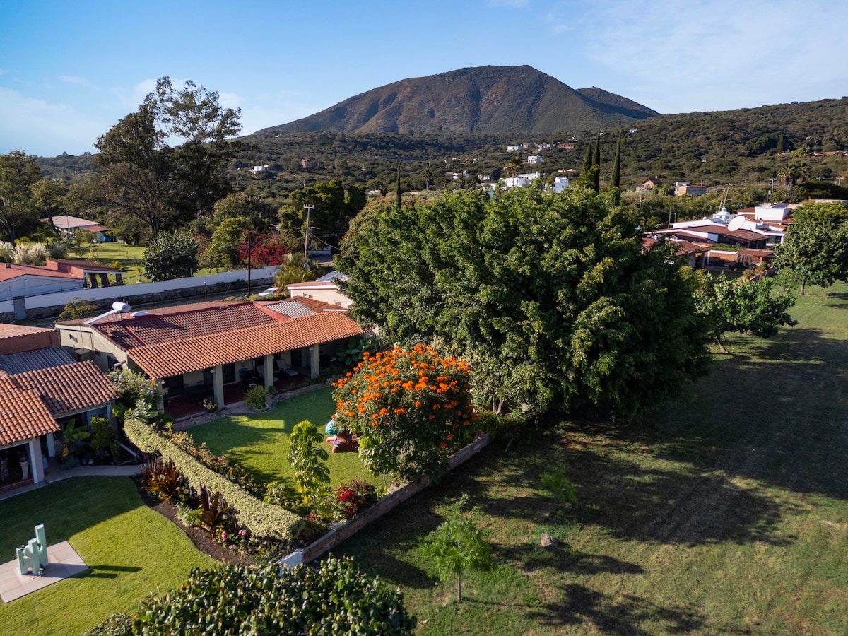 Acogedora casa de campo diseñada por el famoso arquitecto Diego Villaseñor e interiores de Ana Brignone, un deleite estético, muy privada y rodeada de naturaleza, tan solo a 2 minutos caminando del Lago de Chapala. Ideal para descansar de los ruidos de la ciudad, totalmente equipada: alberca templada, tina de hotel en la recamara principal, asador, pantalla de 75" con Disney+, Netlix, Internet satelital de alta velocidad, jardín, cochera y dentro de un fraccionamiento seguro.