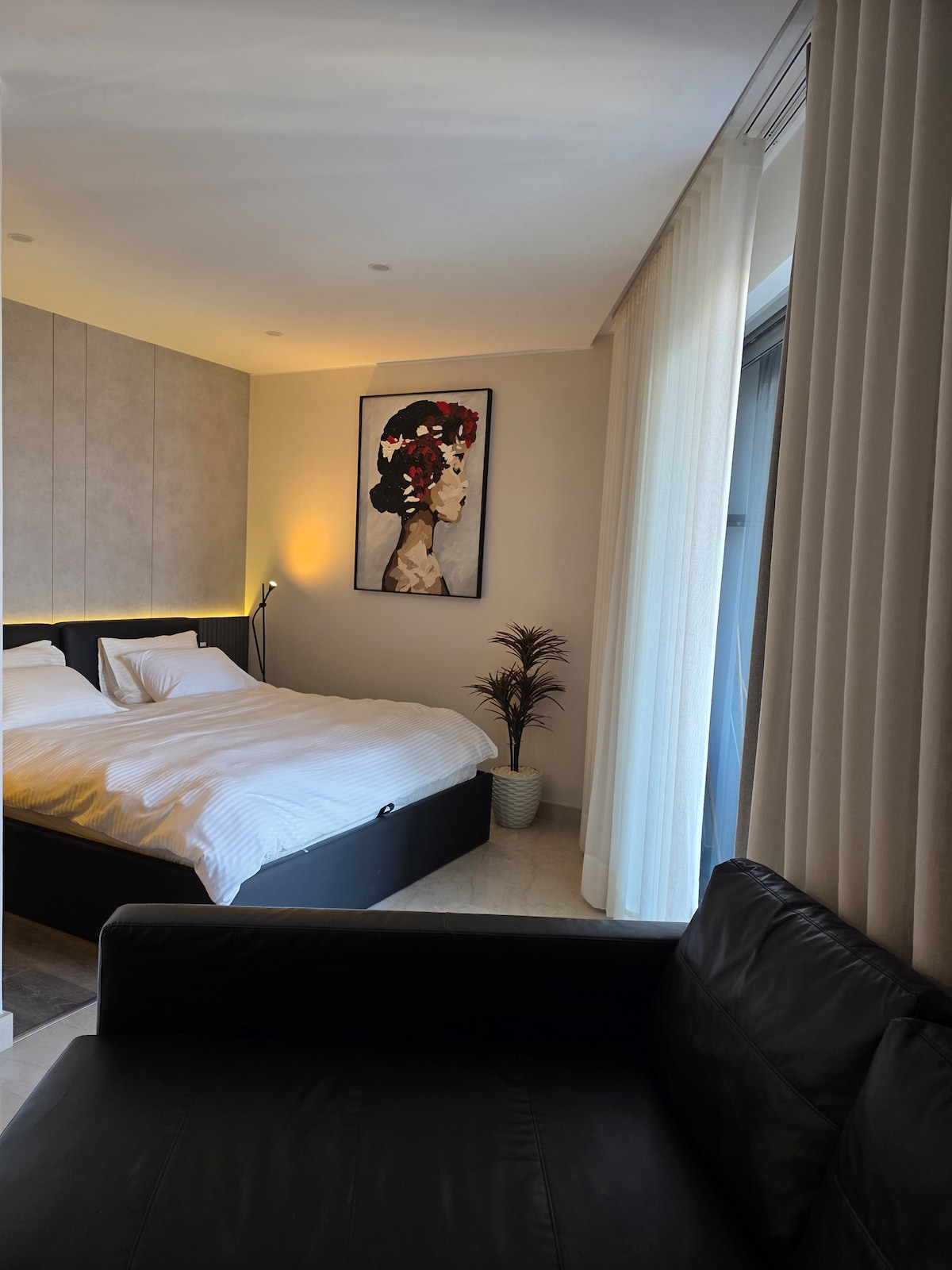 This unique place has a style all its own. A spacious 1-bedroom with a pull-out bed for guests & a full kitchen, on the ground floor with a luxurious backyard and private entrance in a secured compound. Near large malls and business parks in Central Zayed. The compound also has essentials like 24/7 security, gated access, and many nearby convenience stores that deliver. Just 25 min to the Pyramids, 15 to Smart Village, and 20 to the Grand Egyptian Museum.