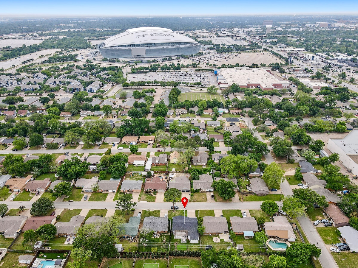 Whether you are relaxing with the whole family or having fun with your friends, our 2 bedroom home sleeps 6 and is the perfect location. We are just 3 blocks from AT&T Stadium where Dallas Cowboys play and the World Cup semi finals will be held this summer, so no need to pay for parking and a short drive to Globe Life Field (Rangers) and Texas Live. Six Flags and Hurricane Harbor are also just minutes away with lots of restaurants nearby.