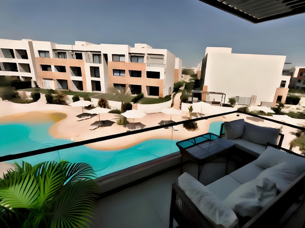 Kick back and relax in this calm, beautifully maintained, two bedroom two bath corner unit in the heart of Ain Sokhna. Completely renovated Wabi-Sabi style home welcomes you with its unique rooms, stunning kitchen, and amazing entertaining spaces immersed with natural light. The view is precious overlooking beautifull swimable crystal lagoons, along with a self-healing green area. Conveniently located close to Cairo Governorate, and about 10 mins from Ain Sokhna gates. “A One-Hour Ride”.