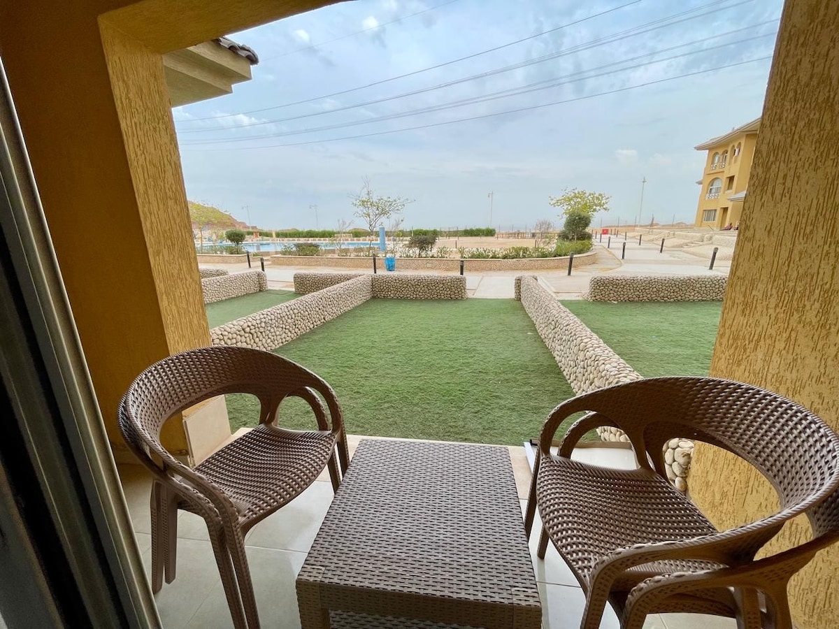شاليه ايجار في المونت جلاله غرفتين 4 سراير مكيف كلو بالعفش سي ڤيو لاجون ٣ دقايق للبحر كمبوند في كل الخدمات 50 دقيقه من العاصمه الاداريه