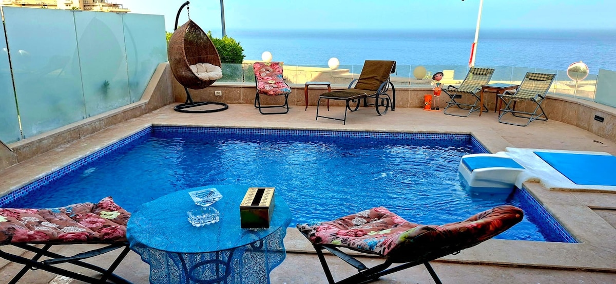 Rocky beach! Families only! sit back and relax at Stella Sea View Ain Sokhna. A standalone home, first row on the beach. Wake up to a beautiful view & a well designed space. The coral & green tones of this home blend perfectly - making this vacation home aesthetically divine. With a big terrace on the beach, you are 2 steps away from the shore and the shared pool. Just relax and take a break from the busy city life. A quiet private location that will certainly put you in a state of pure bliss