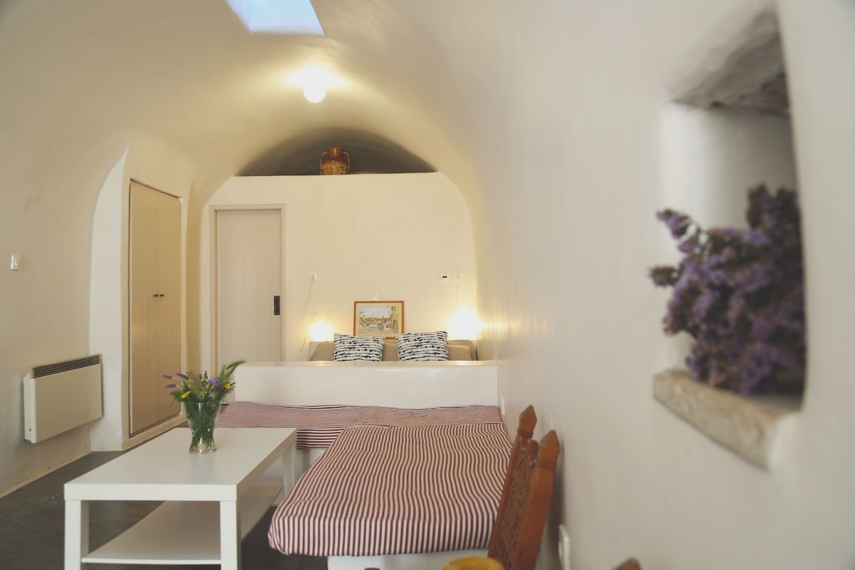 Lanos, the old wine press room, is a nice kamara of about 30 m2 which you can reach through a separate entrance on the road . The courtyard has a small but private terrace. In the living/bedroom there is an open kitchen and a double bed. On the back of the room you will find the bathroom. The kitchen is equipped with all cooking supplies, refrigerator and a 2-pits cooker. The house suited for a couple with perhaps 1 or 2 small children.