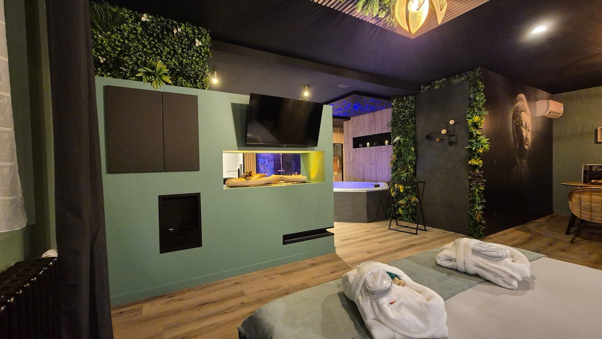 Bienvenue dans notre charmante grange rénovée, nichée au cœur de la campagne. Cette fusion entre le charme rustique de la grange et le confort moderne vous promet une expérience authentique et relaxante, accentuée par notre principal atout : un spacieux jacuzzi XXL offrant différents massages, disponible tout au long de votre séjour. Ici, vous trouverez un véritable havre de paix, idéal pour une déconnexion totale et un ressourcement en pleine nature.