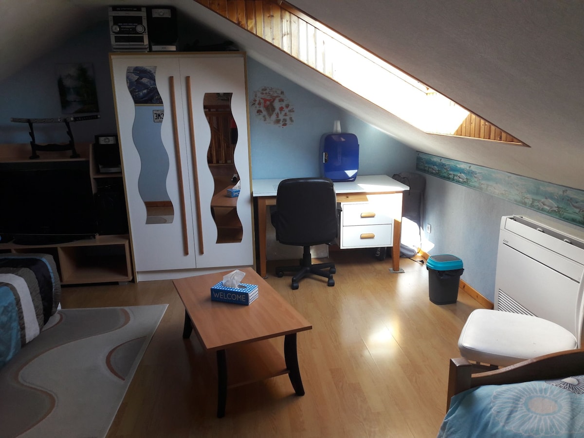 Chambre à l'étage, dans une grande maison calme, avec salle de bain privative (douche +wc) attenante. (draps et serviettes de toilette fournis) Équipée pour prendre un petit déjeuner (cafetière +bouilloire). À 15 minutes à pied de la gare et du centre ville. Wifi.