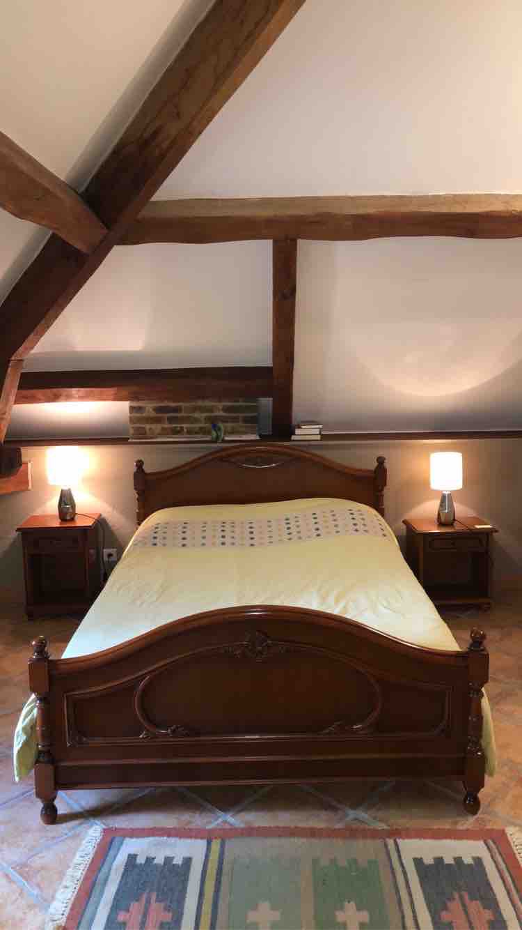 Une chambre equipee d’un lit double attenante à une chambre équipée de 2 lits simple et un berceau . Il est possible de reserver la totalité du moulin (4 chambres) pour 360€ ou 2,3 chambres au prix de 90€ par chambre. 2 Salles de bain privative commune aux 4 chambres en location . Il y a un grand jardin en bord de rivière, parking sur place, petit déjeuner inclus, possibilité de prendre un repas.