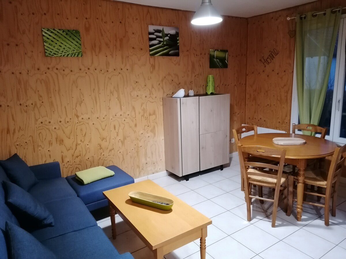 Descriptif : Séjour ( canapé , télévision ) Cuisine ouverte entièrement équipée ( lave vaisselle, réfrigérateur, micro-onde/grill, cafetière Senseo, batterie de cuisine ) 1 chambre avec lit 2 personnes ( linges de lits en supplément) et télévision Salle d’eau avec douche carrelée et WC ( linges de toilettes en supplément) Terrasse équipée avec salon de jardin, barbecue charbon de bois Cellier Espace vert privatif