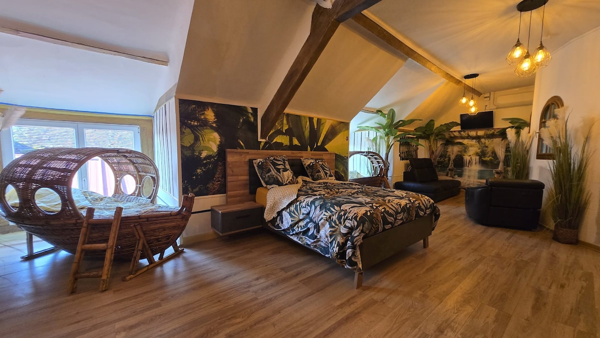 Découvrez notre Loft Jungle 80m² Brut Chic : un espace unique mêlant luxe, nature et vue directe sur le Haras. Idéal pour 6 personnes, il offre clim, salon privé, chambre séparée et couchages bateaux atypiques. Profitez d'une salle de bain neuve avec douche moderne et baignoire balnéo/jacuzzi privatif. Calme absolu, ambiance tropicale et accès cuisine/espaces communs pour un séjour inoubliable, tout cela dans un cadre idyllique dans le cœur d'un centre équestre. Réservez votre immersion unique !
