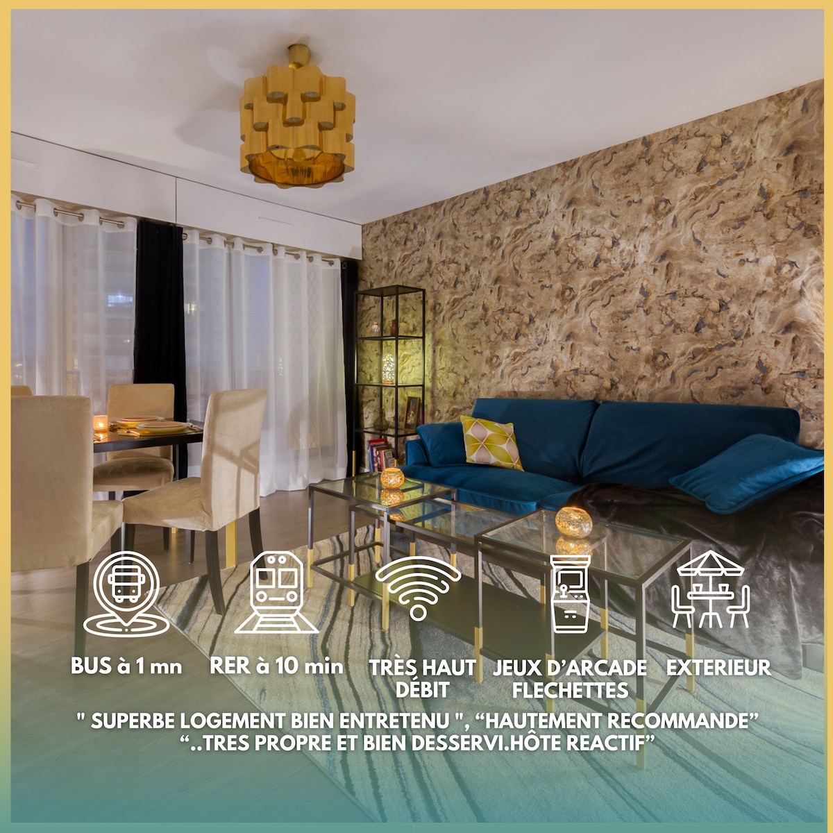 Ce qui rend notre appartement unique, c’est avant tout la proximité immédiate du stade de France, qui est à 50mètres seulement. ⚐ Le style de l'appartement a été pensé pour vous permettre de passer de supers moments: la table de salon est convertible en table de billard, air hockey, ou tennis de table. ❤︎ Vous pourrez vous divertir avec vos amis ou votre famille tout en profitant de la vue dégagée depuis le balcon sur la basilique Saint-Denis et le canal Saint-Denis, sans aucun vis-à-vis. ☼