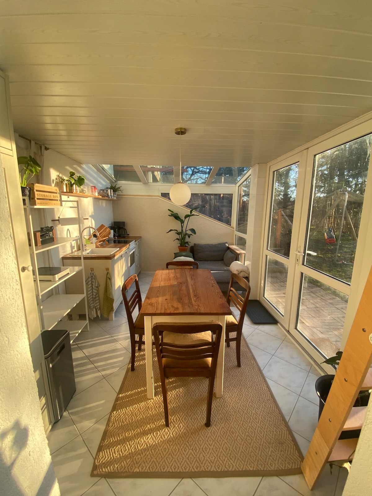 Lehne Dich zurück und entspanne dich - in dieser ruhigen, stilvollen Unterkunft: Im EG bietet ein großer, offener Wohn-Essbereich Platz für gemütliche Stunden, alternativ bei schönem Wetter auf der Terrasse. Im 1. OG steht 1 großes Doppel-Zimmer, plus ein großes Duschbad mit Whirlpool zur Verfügung. Ein weiteres Schlafzimmer als Einzelzimmer ist nach Rücksprache dazu buchbar. Die Gastgeberin wohnt im UG mit eigenem Duschbad, lediglich die Küche ist zur gemeinsamen Nutzung vorgesehen.