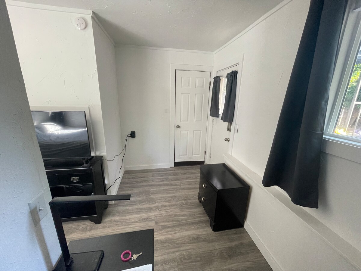 Studio is conveniently located downtown Puyallup, above garage. Air conditioned unit includes a full kitchen(stove, refrigerator, and dishwasher) with single serve coffee maker, private bathroom with slate tile flooring, and a small utility closet with a washer and dryer. 32" TV, Blue-Ray/DVD player, WiFi, and bedside table lamps with USB ports. Leather power reclining loveseat with powered head rest that also has usb ports on the side. Very close to bus route, and the Washington State Fair.