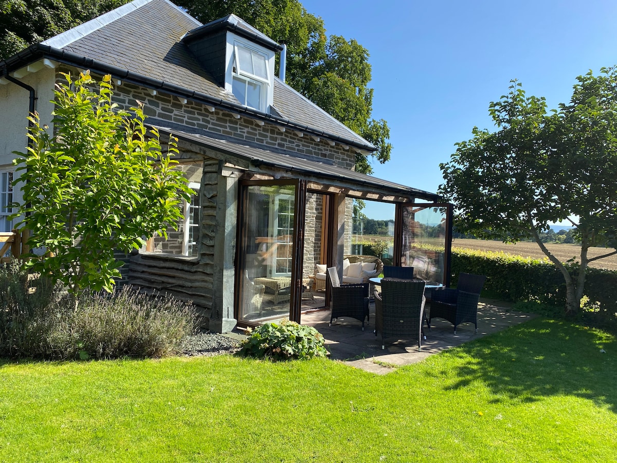 Spacious riverside cottage 2 miles outside Crieff, stunning south facing and decked balcony over the river. Situated within the grounds of Victorian private house. Recently refurbished with spectacular views across fields. Includes 1800cm superking bed, bath and shower. Perfectly situated for exploring and only 10/20 mins from the only two 2* Michelin restaurants in Scotland. We now also have an outside bath house in the garden where you can lie back and enjoy the views beside the river.