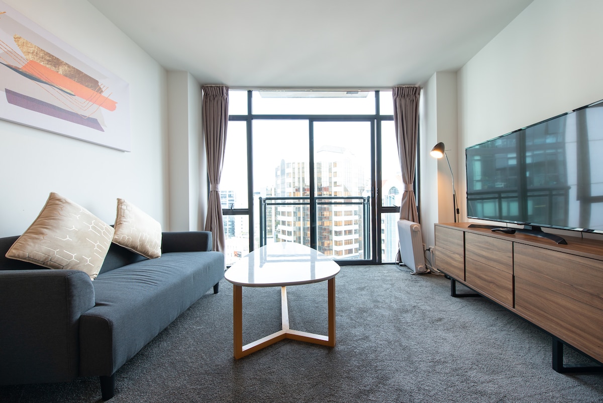 A large spacious 65sqm 1 Bedroom fully furnished apartment at the Spencer On Byron 4.5 star Hotel in Takapuna. This is a unique corner apartment and has two large balconies flowing from the bedroom to give you an open plan living feel.You will have access to the pool and hot tub, gym and also tennis court! The apartment has a full kitchen and laundry as well as an open plan living and dining area. TV has full Sky TV package. Perfect for couples and business travellers (dedicated desk space).