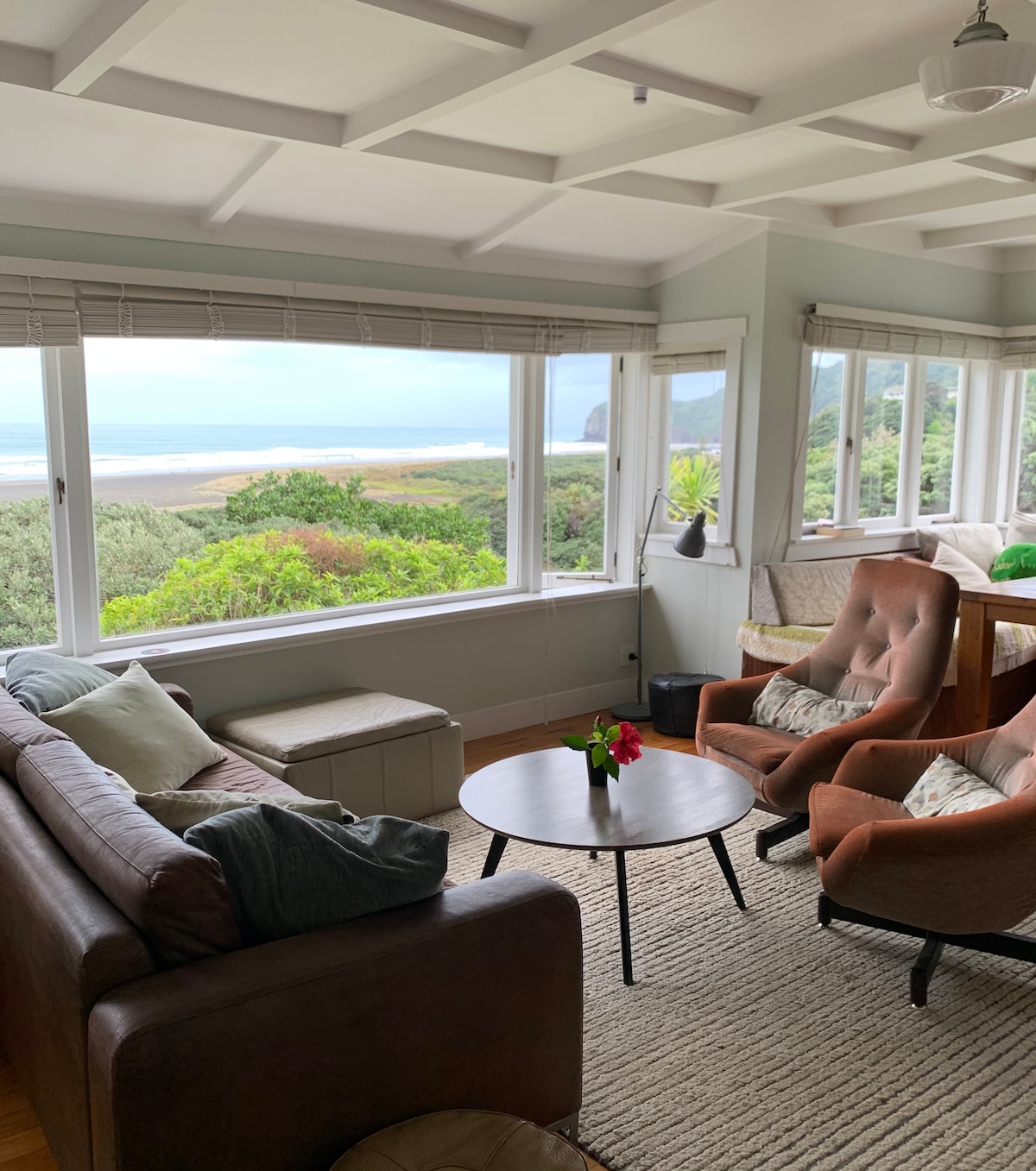 Piha Beach Bungalow is 5 minutes walk to beach, 10 minutes walk to piha store, café, library, art gallery, tennis court and bowling club, It has 180 degree views of the ocean yet is secluded being tucked back into hill and sheltered from prevailing winds. It has easy street level access. Come and relax in our quintessential Kiwi surf bach, lounge on comfortable cushions under the pohutakawa trees and listen to the waves in the background and watch the sun set over the ocean.