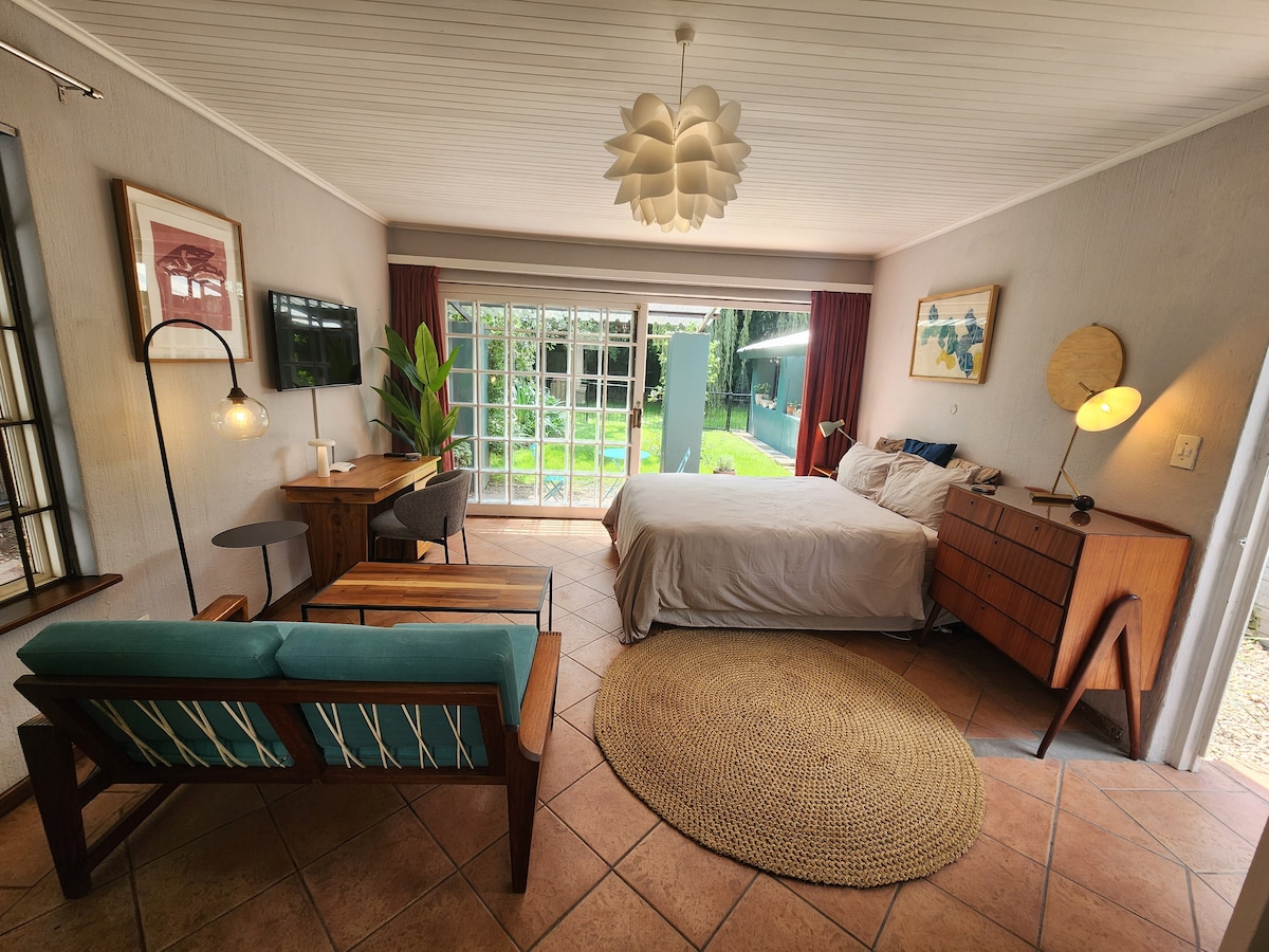 Sunny and spacious private cottage set in quite leafy garden with its own private entrance and Patio. Solar power means that load shedding is no issue. It comfortably accommodates two people in a queen sized bed. Offers a kitchen with granite counters and induction cooking plates as well as microwave and fridge. smart TV (Netflix), Desk / breakfast bar with USB connected plugs. Free Fiber 100Mbs Wifi. Large closet as well as bathroom with high pressure shower and separately enclosed toilet.