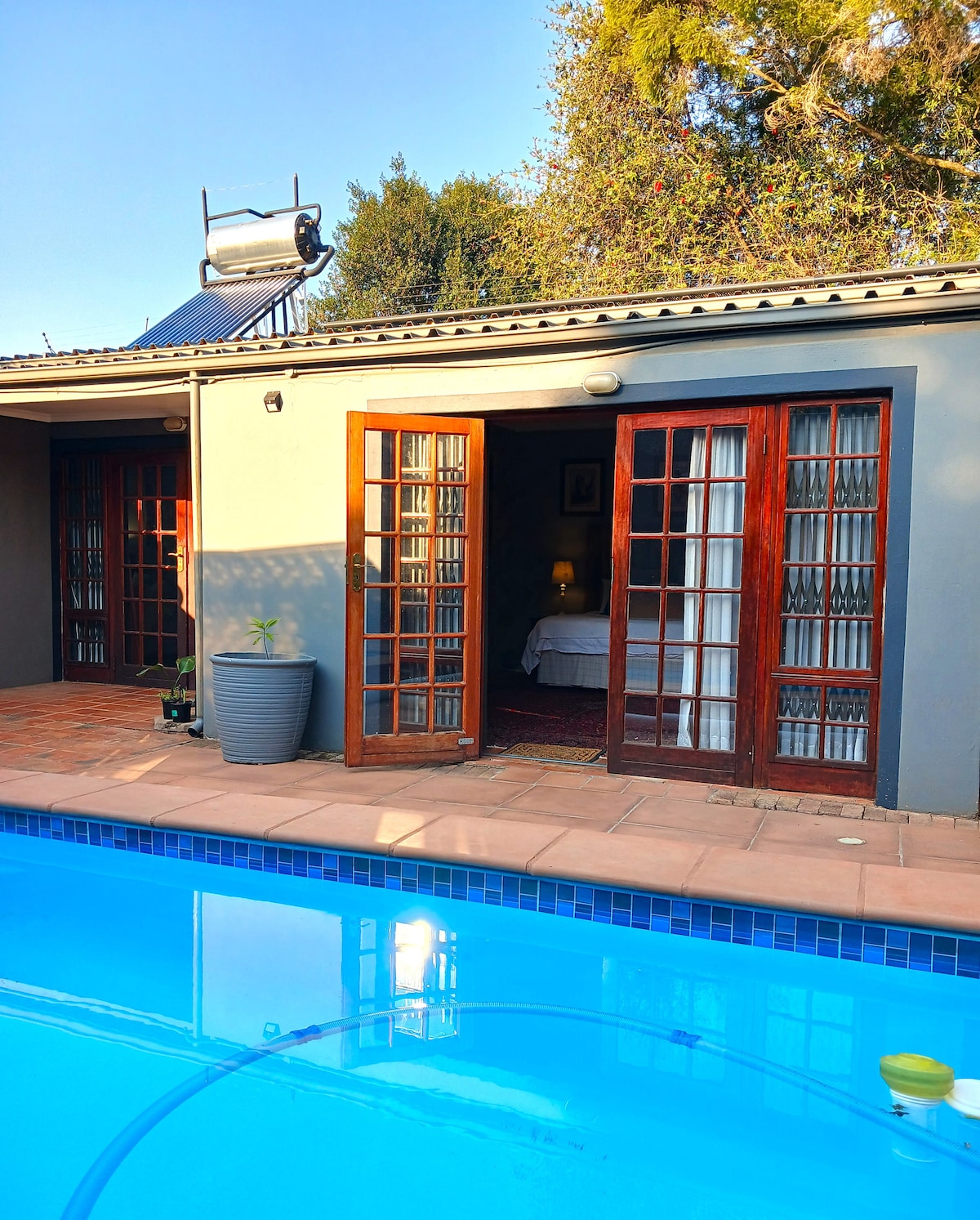 Our cottage, with backup Solar and Water Tanks to ensure our guests stay comfortable, is tucked away under a big sweet gum tree. Guarded by our two friendly Chow Chow dogs the cottage looks out on our pool and has its own outside patio and braai area. Inside the cottage is a cozy studio apartment with a kitchenette, study nook with WiFi, a cupboard and a comfortable double bed. The separate modern bathroom is stocked with fresh towels and soap.