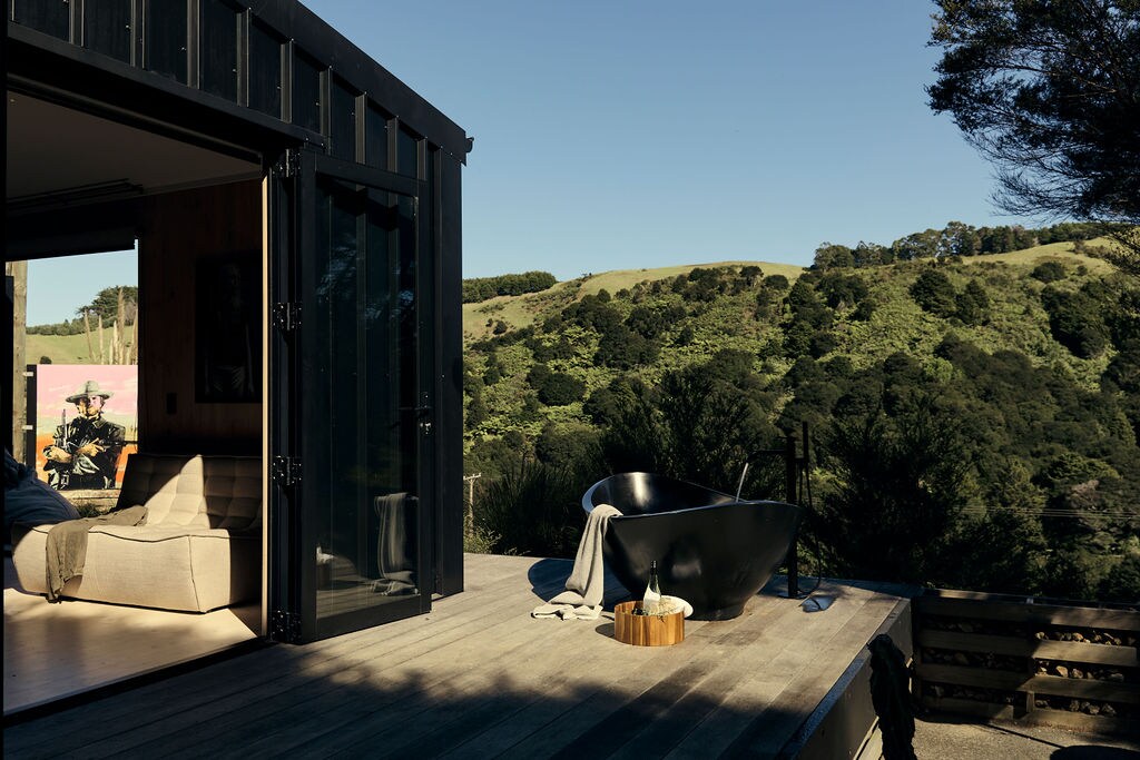 A unique farm cottage overlooking a valley farm with animals close at hand. Laze in the outdoor claw foot bath on a private deck, or warm up by the outside fire. A beautiful bathroom with a large tiled shower awaits after a long day adventuring, the rustic kitchenette and outdoor BBQ will let you feed your soul while you sit and enjoy the view! 10 mins from West City Mall and on one of the main routes to Piha, 30 mins to Piha Beach. Nestled between other farm buildings by still very private.