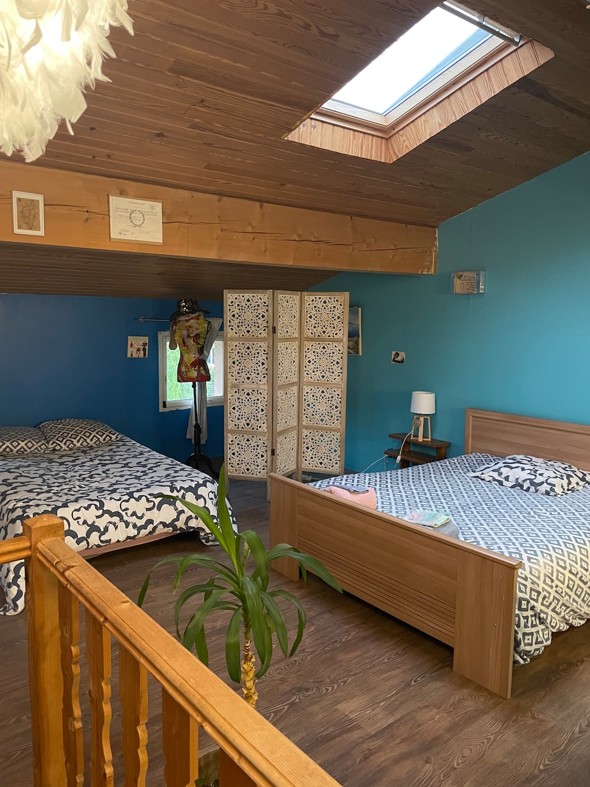 La chambre, spacieuse (23m2)se trouve au 1er étage d’un loft atelier d’artistes ( stages sculpture /céramique) : entrée indépendante, salle d’eau, WC, douche. Au rez-de-chaussée, petit déjeuner, produits locaux et confitures maison. Vous disposez d’un espace cuisine privé avec réfrigérateur et petit salon.(32m2) ainsi que lave linge. The room, spacious has a shower room. Breakfast, whith local products. Private kitchen area with fridge and living room.