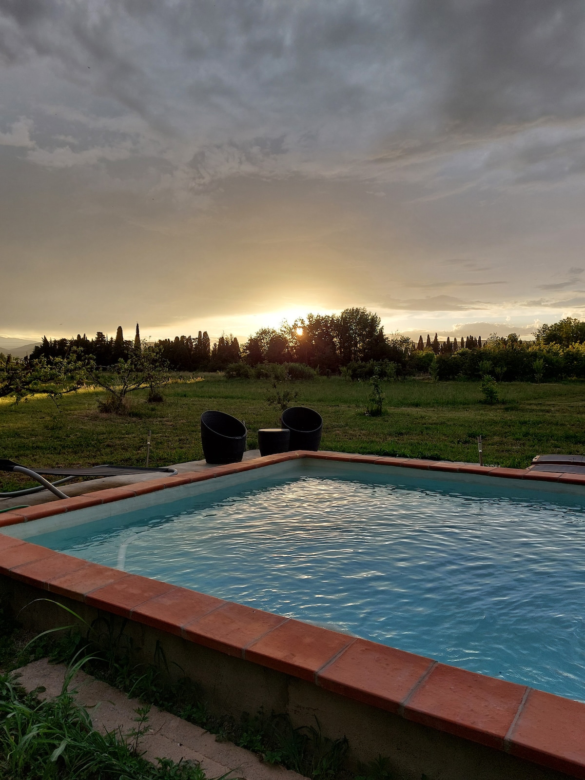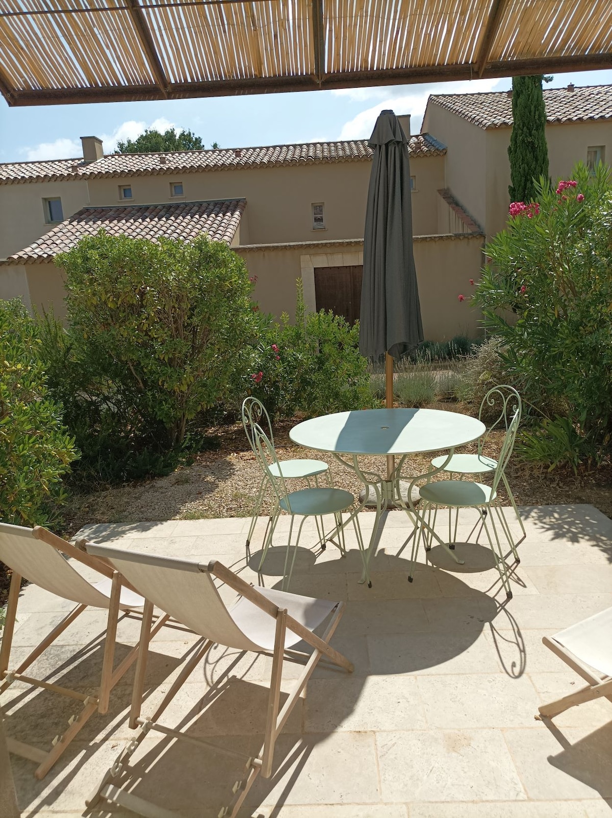 Détendez-vous dans ce studio climatisé de 30 m2 donnant sur une piscine chauffée(juin-sept), situé à côté de la maison des hôtes (bout d’un lotissement), espace extérieur partagé (petit poulailler, tortues, 2 spitz nains). Votre intimité sera préservée. Le studio: canapé-lit (vrai matelas 140x190), kitchenette, réfrigérateur, Dolce Gusto, rideaux occultants. Linge de maison inclus. La salle de bain :douche, sèche-serviettes, sanitaire. Table de ping-pong. Supermarché&pharmacie à 100m.