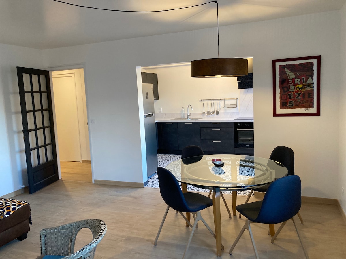 Dans un environnement naturel sur un terrain arboré de 4600 M2. Profitez d'une étape reposante (linge de lit et de toilette fourni). A proximité du canal du midi. Piste cyclable du Canal du midi à 100 m. Studio indépendant au rez-de-chaussée de notre habitation principale. Arrivée autonome possible. Entrée indépendante. Stationnement devant l'appartement sur notre terrain clôturé. Possibilité de mettre des vélos à l'abri. Alimentation , boulangerie et laverie ouvertes 7/7 7h-19h30 à 800 m.