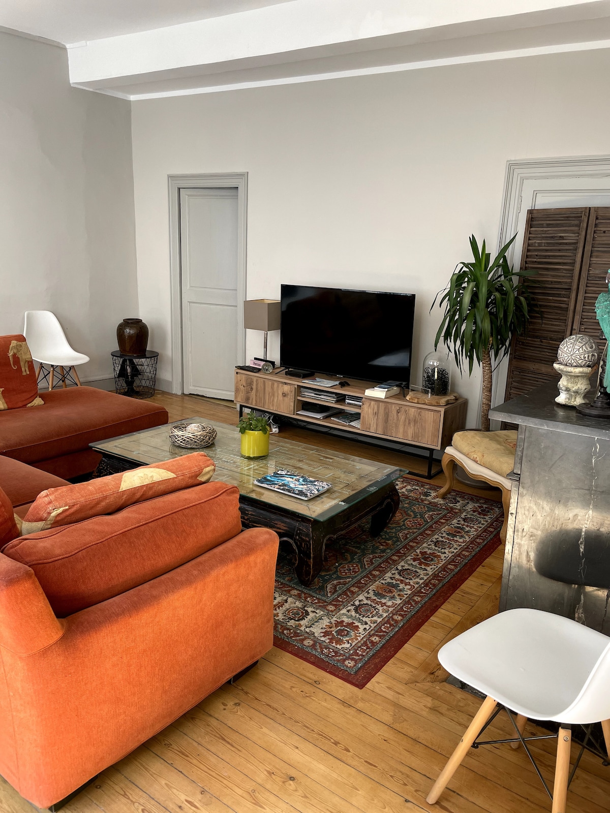 Dans notre grande propriété nous vous proposons un appartement pour se retrouver en couple, en famille, entre amis. Il est composé d'une seule pièce à vivre avec un coin chambre avec lit 160×200, d'une cuisine équipée, d'un coin zen avec le Jaccuzi, d'un coin TV avec canapé convertible, d'une salle de bain avec douche et d'un espace extérieur. Possibilité de réservation de paniers repas 50€ pour 2 et des petits déjeuners 7€/pers. Proche de la cité et du canal, 10 min du centre ville.