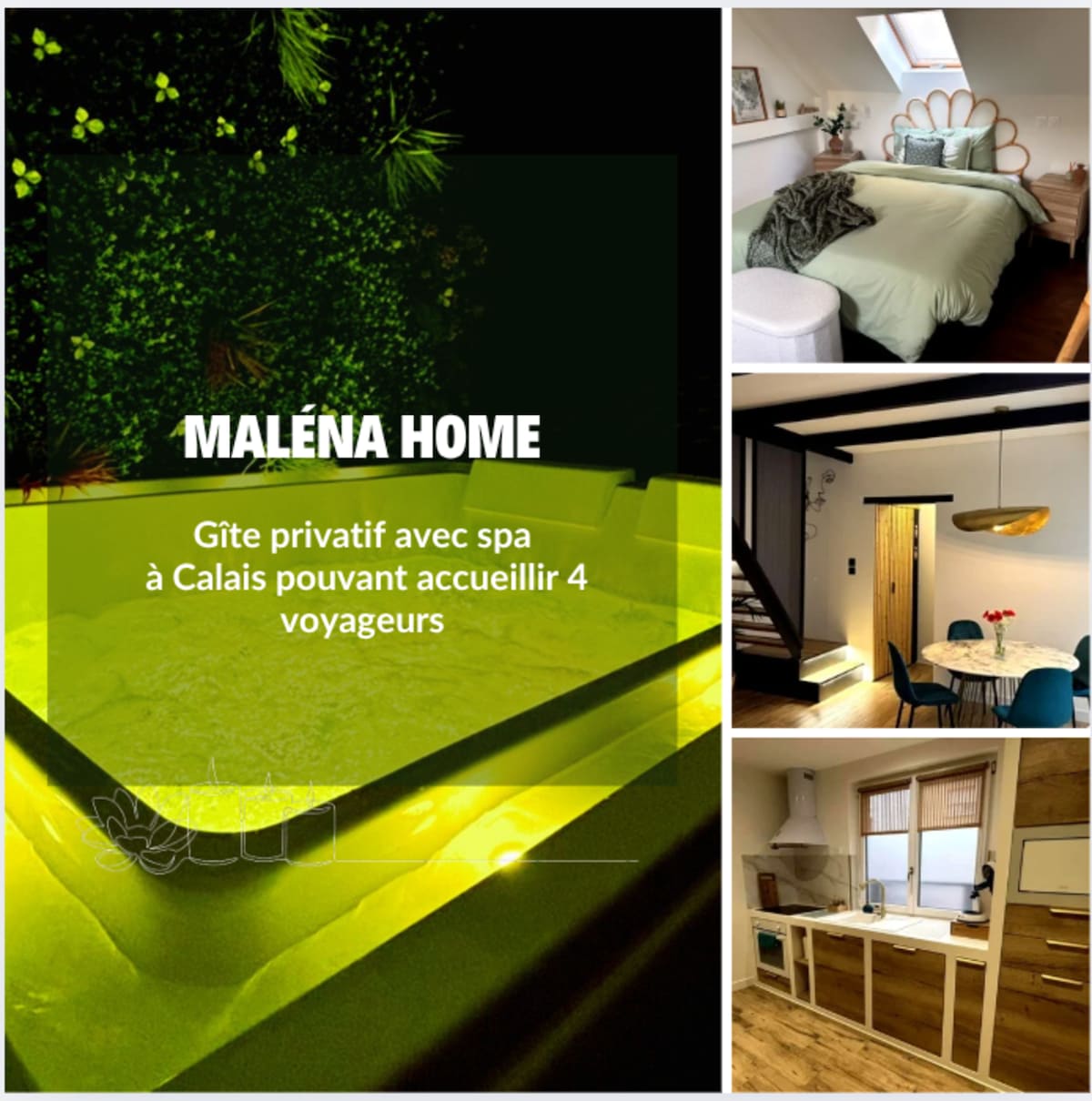 Nous serions ravis de vous accueillir à " "Maléna Home" notre élégant gîte dans la jolie ville de Calais. Vous y trouverez une chambre spacieuse, une salle de bain moderne avec balnéothérapie qui a tout d'un spa, vous offrant tout le confort nécessaire pour un séjour inoubliable. Dans le séjour un canapé-lit tout confort, permettant d'augmenter la capacité d'accueil de 2 à 4 personnes. Et une cuisine entièrement équipée... ideal pour de cours comme de longs séjours