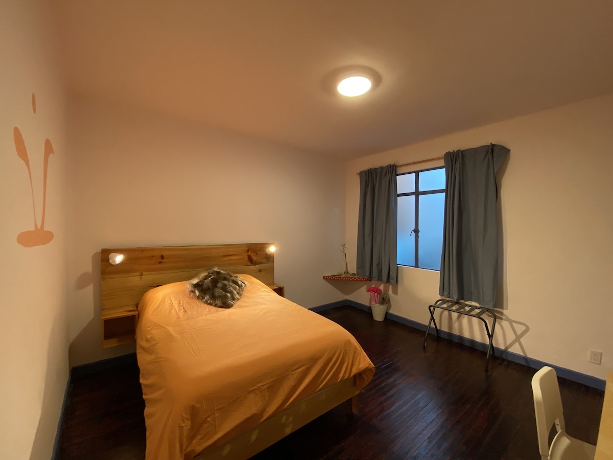 Lindo departamento en el corazón de Coyoacán, muy iluminado, completamente equipado, cuenta con 1 recámara con 2 camas matrimoniales, 1 sofá-cama matrimonial. Este departamento es perfecto para 3 adultos y 1 menor, o 2 adultos y 2 menores. Está a 3 calles del museo Frida Kahlo, a media calle del museo León Trotski y a 6 cuadras del Zócalo de Coyoacán.