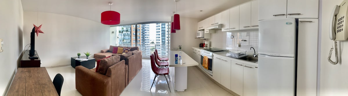 Departamento de Lujo, en la mejor zona, fácil acceso, cerradura inteligente (abre con código), amplio estacionamiento, 8 elevadores, seguridad 24 hrs, Amenidades (Gym, Jaccuzy, Cine, Cafetería, Alberca, Ludoteca), vista inmejorable, piso 31, mobiliario de alta calidad, sala con Smart TV de 60" 4K Ultra HD y de 43" en la habitación, recamara italiana, ropa de cama de lujo, colchón premium de memory foam, toallas premium, cocina equipada, wifi, sofá cama. Son bienvenidas todas las personas.