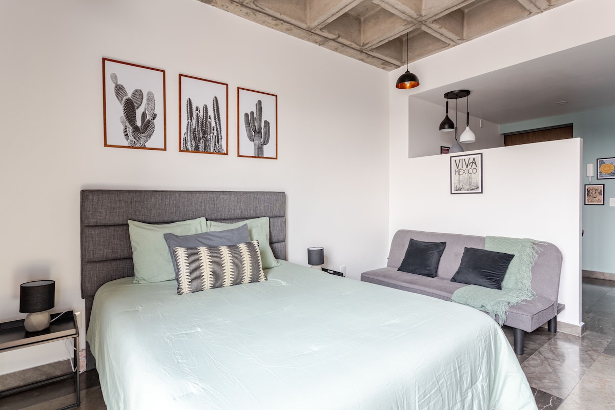 Prime Location. Discover elegance and comfort in our 325-square-foot studio in the heart of Roma Norte and Condesa! Immerse yourself in an oasis of personal style with understated and modernist decor. Enjoy a comfortable king-size bed with cotton sheets and a seamlessly integrated, minimalist-designed bathroom. Located within a historic property with a tranquil interior courtyard. Ideal for art enthusiasts and lovers of sophistication. Book now and experience a unique stay in Mexico City!
