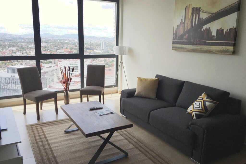 Located in the heart of Roma Norte the most beautiful neighborhood of Mexico City. Located around many restaurants, cafes, bars, shops and more. On the 15th floor this apartment is uniquely quiet and has incredible panoramic city views. It has a gym, laundry and fast Wi-Fi