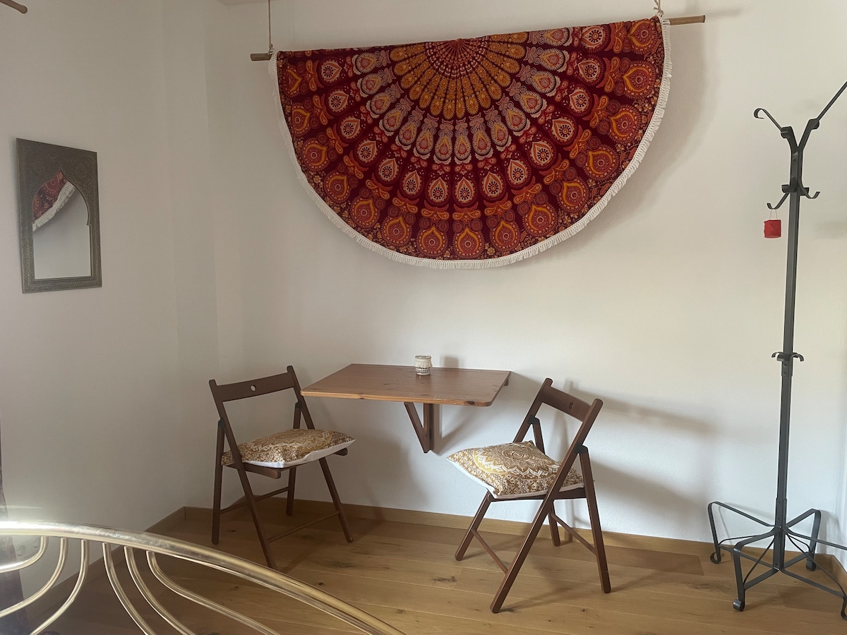 Gemütliches Zimmer im orientalischen Stil mit Doppelbett und Sitzecke. Das private Bad mit Dusche befindet sich direkt nebenan. Kinder und Haustiere sind willkommen. Auf Anfrage kann ein Hundekorb oder Kinderreisebett hinzugefügt werden. Ebenfalls können unter Vereinbarung Fitnessraum/Garten/Kinderspielzimmer mitbenutzt werden. Auf Wunsch bereite ich ein veganes/vegetarisches Frühstück im Bio-Qualität zu.